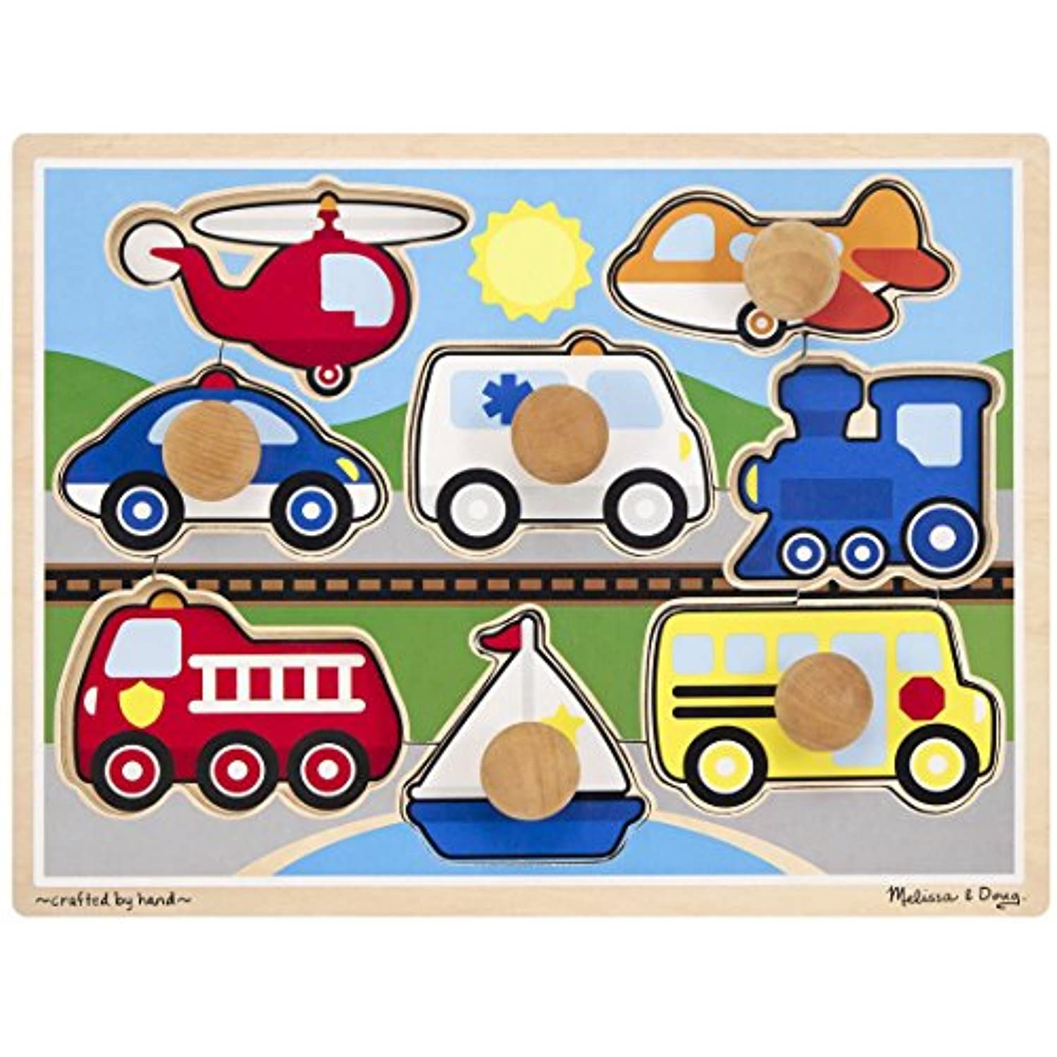 Eight big pieces with oversize knobs make this the perfect first puzzle! The bright, cheerful artwork features a collection of favorite vehicles in the air, land, and sea. Each one has its own illustrated well in the sturdy wooden puzzle board, encouraging young children to associate the pictures, maneuver the pieces, and build important fine-motor and cognitive skills through play.