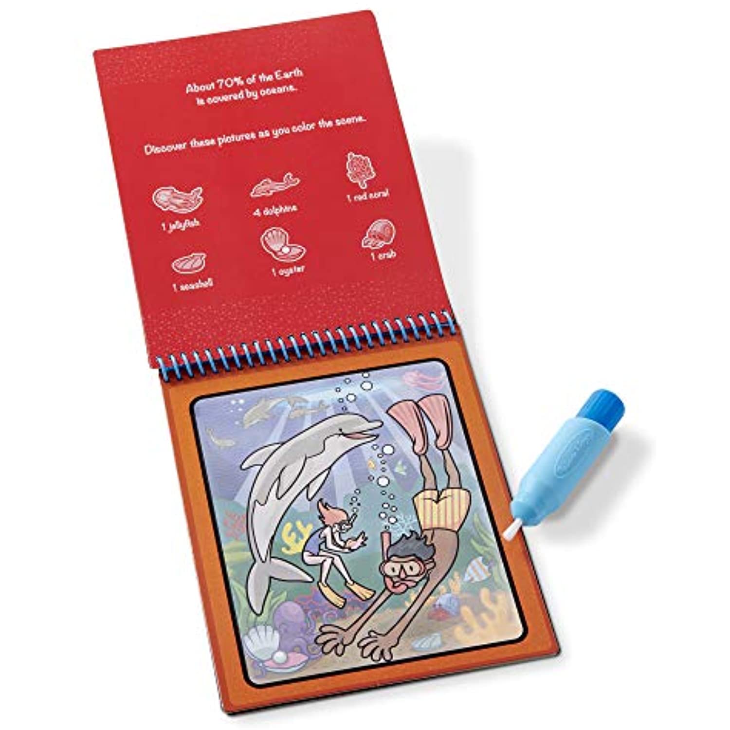 Experience no-mess painting-andd learning-forr kids on the go! these three exciting Melissa & Doug paint-with-water coloring books each include four reusable pages and a refillable no-leak water pen. Use the pen and watch details and vibrant color appear with every stroke! then, let the page dry to "erase" the pictures, and fill it in again and again. Explore dinosaurs, adventure scenes, and animals. Each spiral bound book includes four pages with search-and-find activities on each page. The chunky-sized water pen is easy for kids three and older to hold and stores neatly in the front cover, so water wow books make ideal travel activity books for kids!