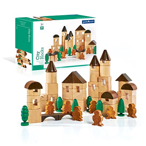 Guidecraft City Building Blocks - 65 Piece Themed Educational Wooden Toy with Storage Bag, Includes Trees and Town People