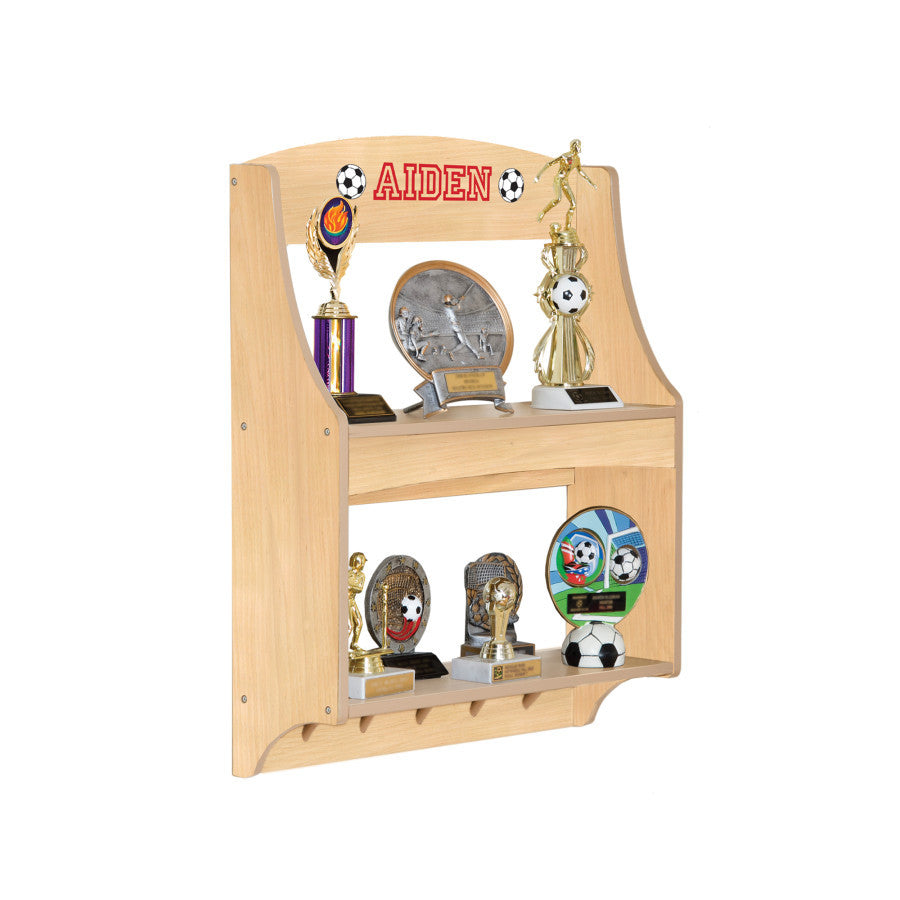 - Wall mounted shelves for displaying trophies and accomplishments with a durable, child-safe construction