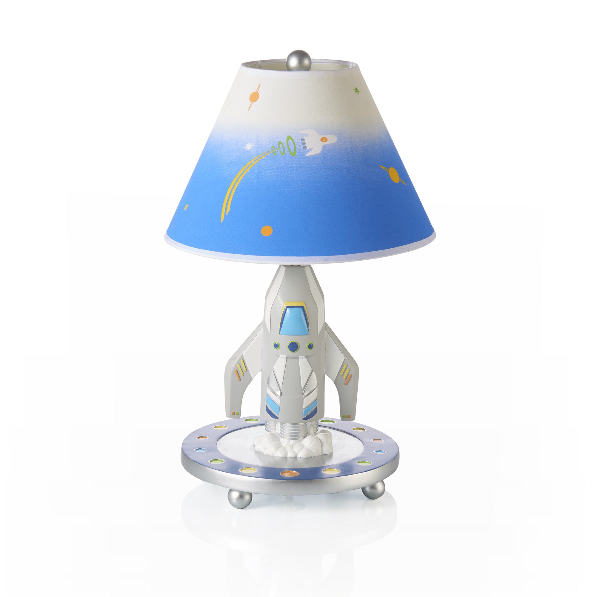 Illuminate the final frontier with this space-themed tabletop lamp. Featuring a handsome blue and white fabric shade with outer-space elements over a hand-painted resin rocket ship base, this is ideal for brightening any little explorer’s bedroom or play space. Some assembly required. 11.5″Dia x 19″H.