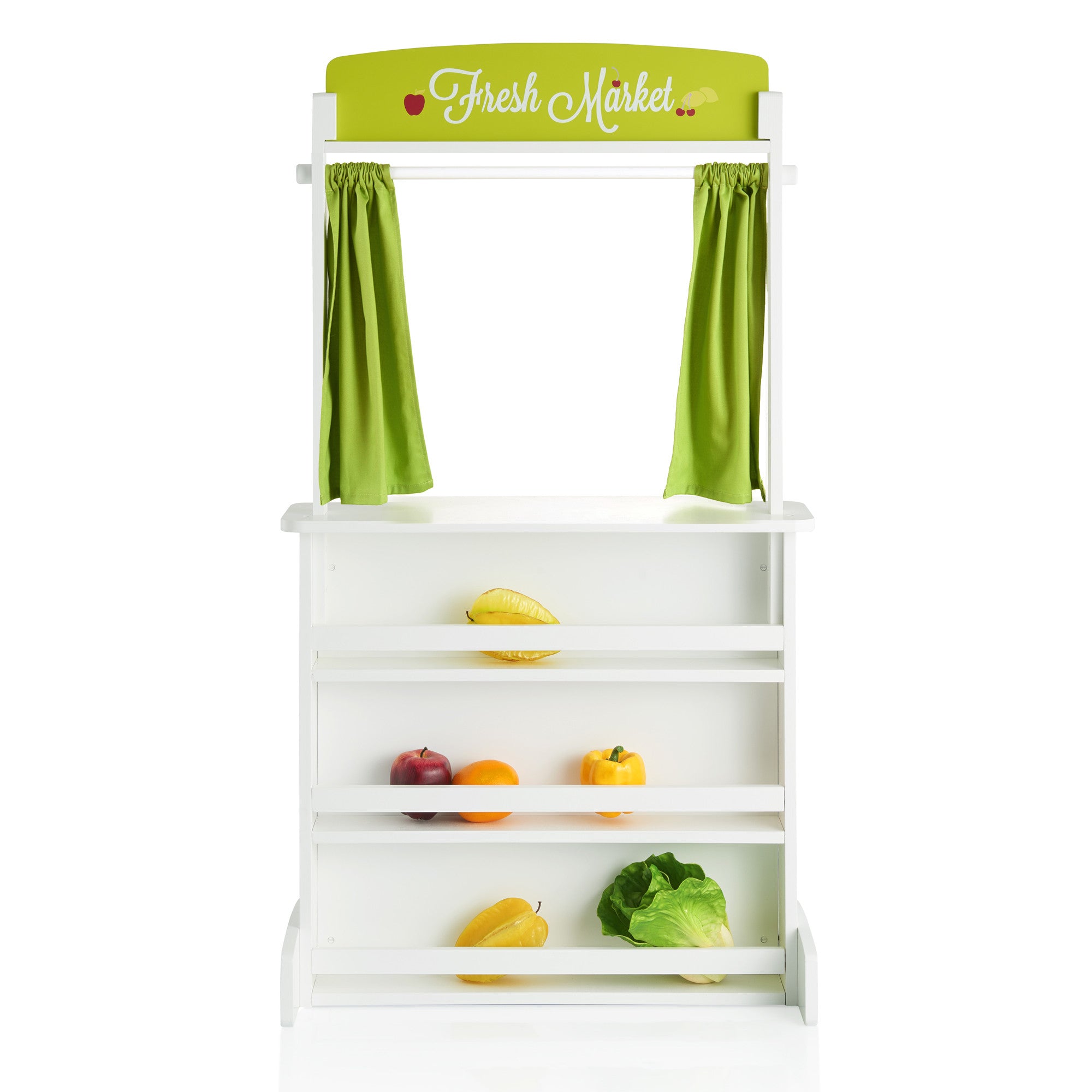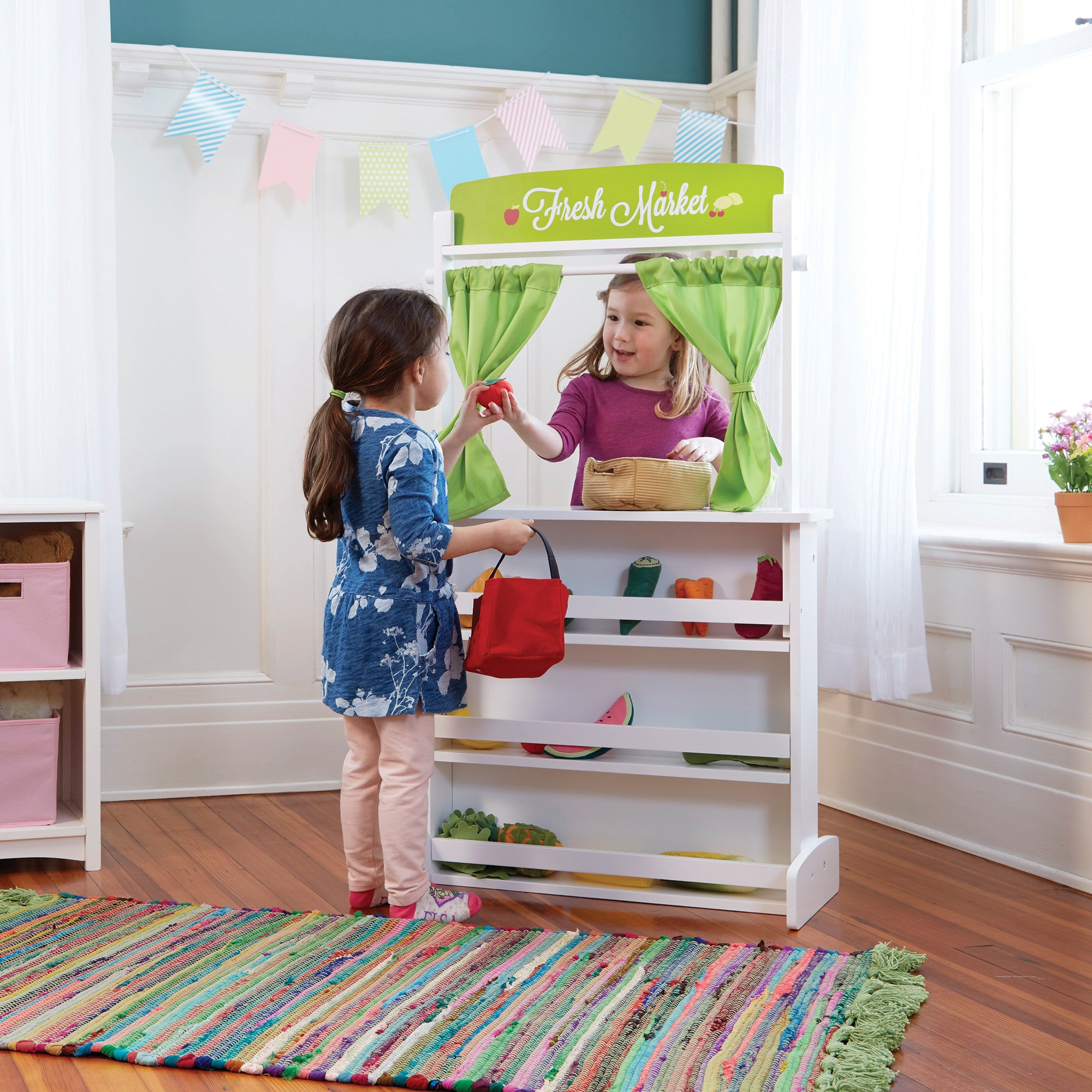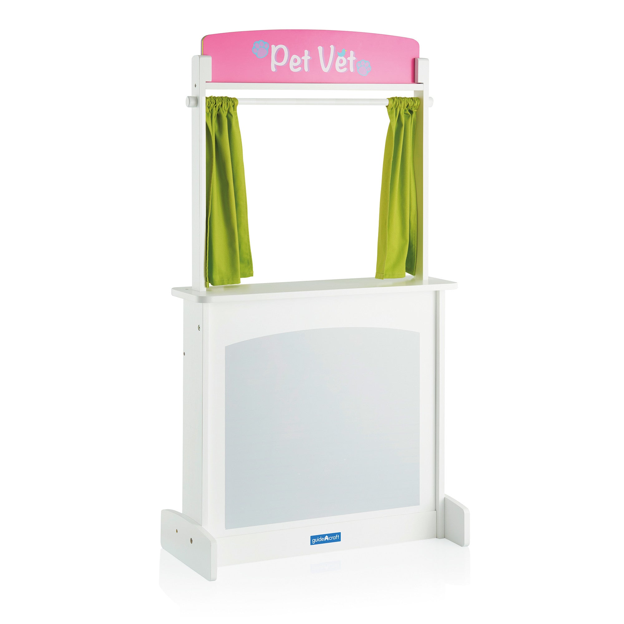 The stage is set, let the show begin! The Showtime Floor Theater features fun, colorful, interchangeable marquis signs: “Fresh Market”, “Pet Vet”, “Showtime”, or the chalkboard marquis for your child’s original theme! Below the ledge is a chalkboard panel for special announcements. Light green curtains pull back to enhance the theatrical experience. Sturdy, non-tip base and durable, solid wood frame ensure years of use. Interior of the theater features handy shelves for keeping puppets or props. Ages 3+. Dimensions: 26″W x 12″D x 48″H. Some assembly required.
