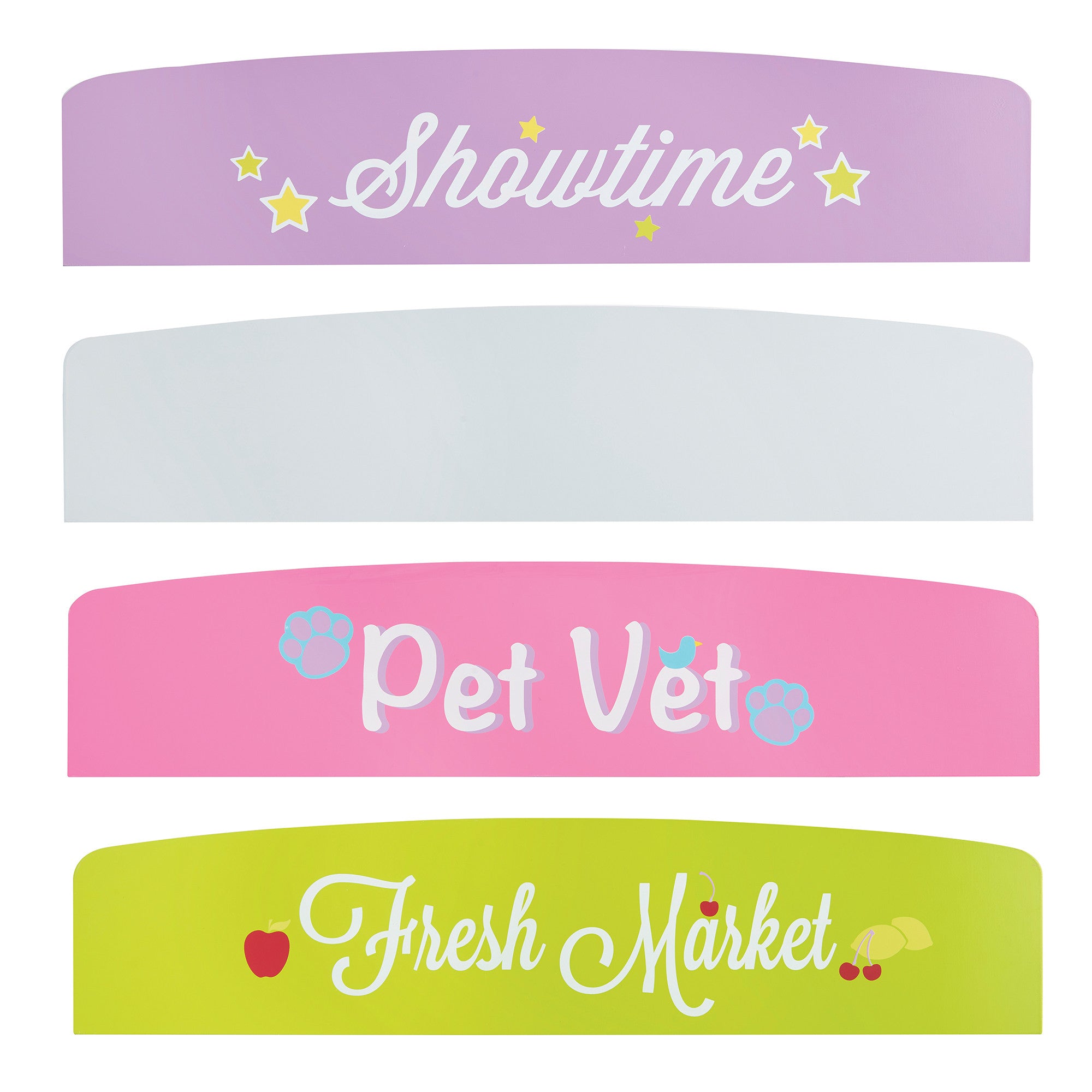 - Includes 2 double-sided marquis: “Fresh Market” and “Pet Vet,” “Showtime” and chalkboard surface for unique themes.