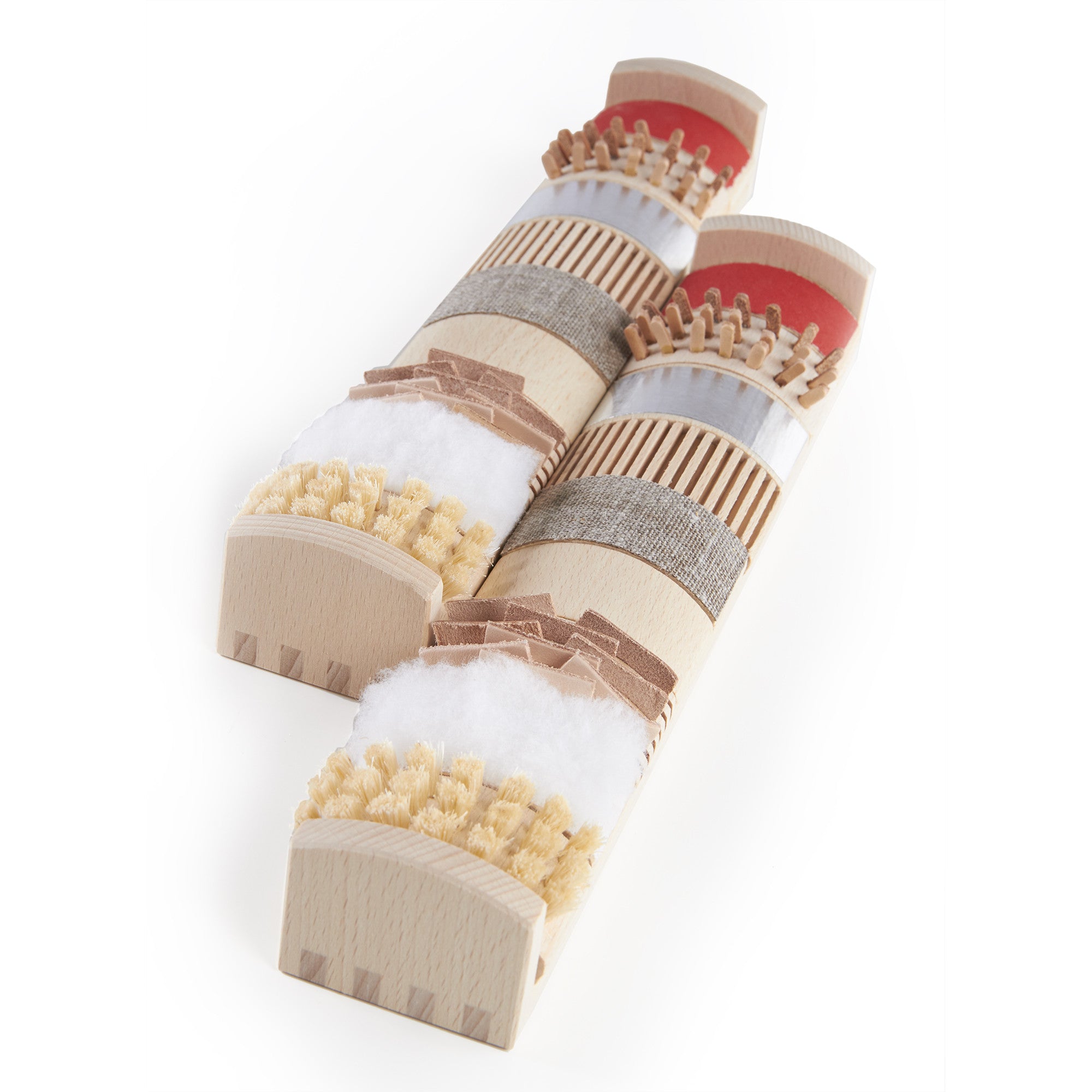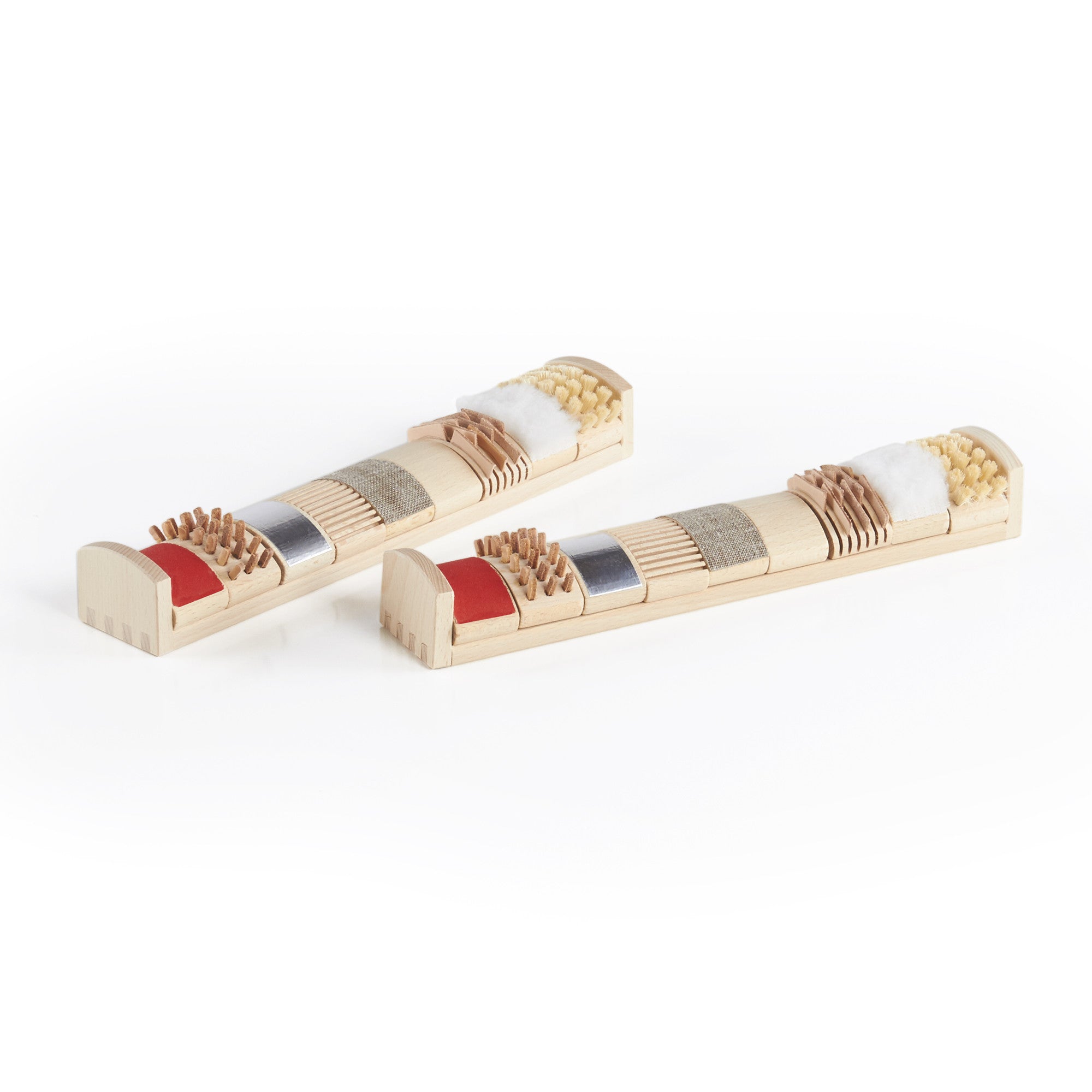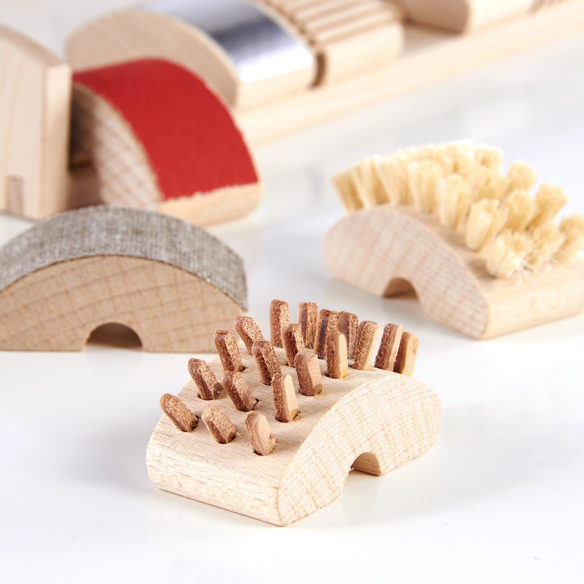 - Material: Beech hardwood and various textures such as brush bristles, sandpaper, felt and cork