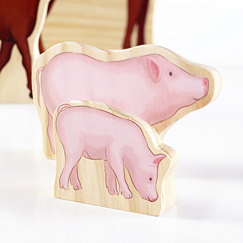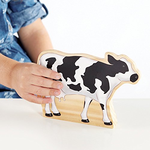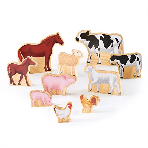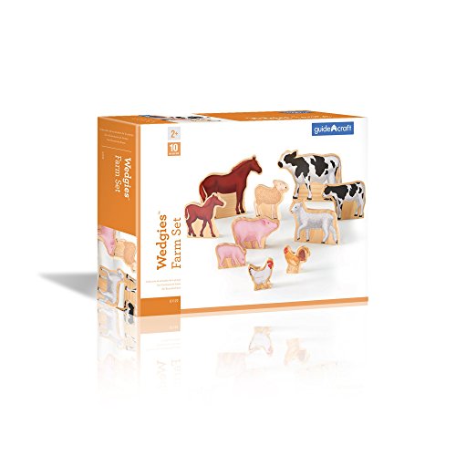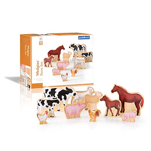Wedgies, Guidecraft's classic wooden toy, balances both dramatic play and block play with colorful, charismatic characters. Set of 10 favorite farm animals coordinates with all Wedgies sets; horse, foal, cow, calf, pig, piglet, sheep, lamb, rooster and chicken. Solid wood, wedged-shaped characters feature double-sided artwork with intricate details and personality, and wide, no-topple bases. Figures range from 2.25"H to 5.5"H.