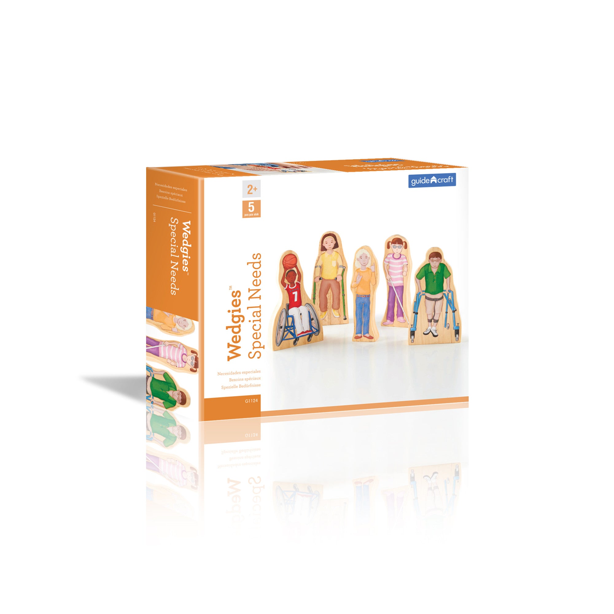 Wedgies, Guidecraft’s classic wooden toy, balances both dramatic play and block play with colorful, charismatic characters. Five active children with special needs promote positive awareness. Solid wood, wedged-shaped characters feature double-sided artwork with intricate details and personality, and wide, no-topple bases. 4.5″H figures.