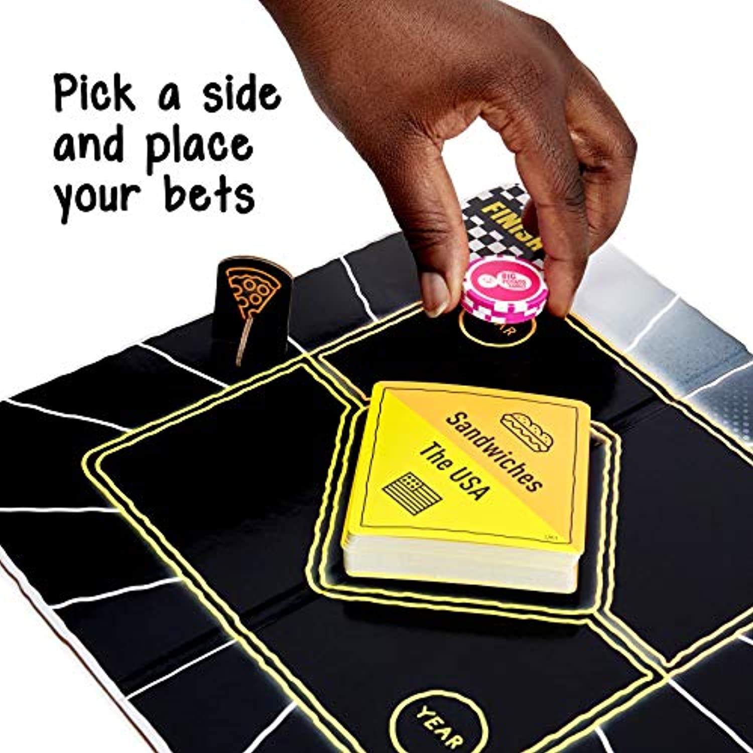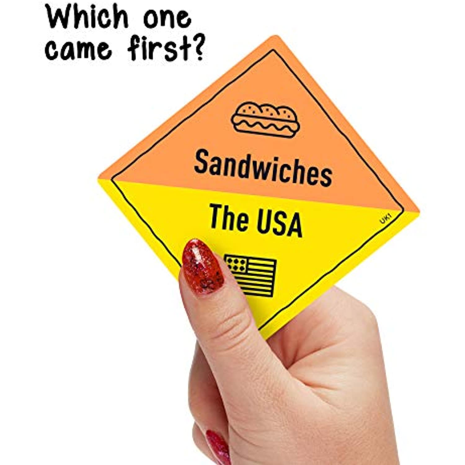 King Kong vs ping pong? Cher vs Tupperware? Statue of Liberty vs The Eiffel tower? Ever wondered what came first? Prepare to find out the answers to these crazy questions and so many more When you play one of the best New board games of 2019. With 200 question cards to choose from It's time to pick a side and place your bets. In this simple but addictive team game, Your aim is to guess which of the two options on the card came first and successfully bet on the outcome. The more you win, the faster you'll move around the board. The team with the dealer chip goes first. They choose to Either bet one, two or all three of their chips on what you think is the ‘correct’ side of the board. If you're feeling really confident and think you know the exact year, you can place a chip on the year circle. Guess correctly and that's five extra points. If you bet successfully move the same number of squares around the board as the chips you bet. If you bet wrong then move backwards The same amount of squares as the chips you bet. If you happen to land on one of the time tokens dotted around the board then you might be in for a bonanza or a bust. The first team to get all the way around the board, wins! It's the ultimate good-time party game, full of teamwork, surprises and the buzz of bet-winning glory. What came first is a total blast – one of the best board games for families, friends, strangers and sworn enemies around.