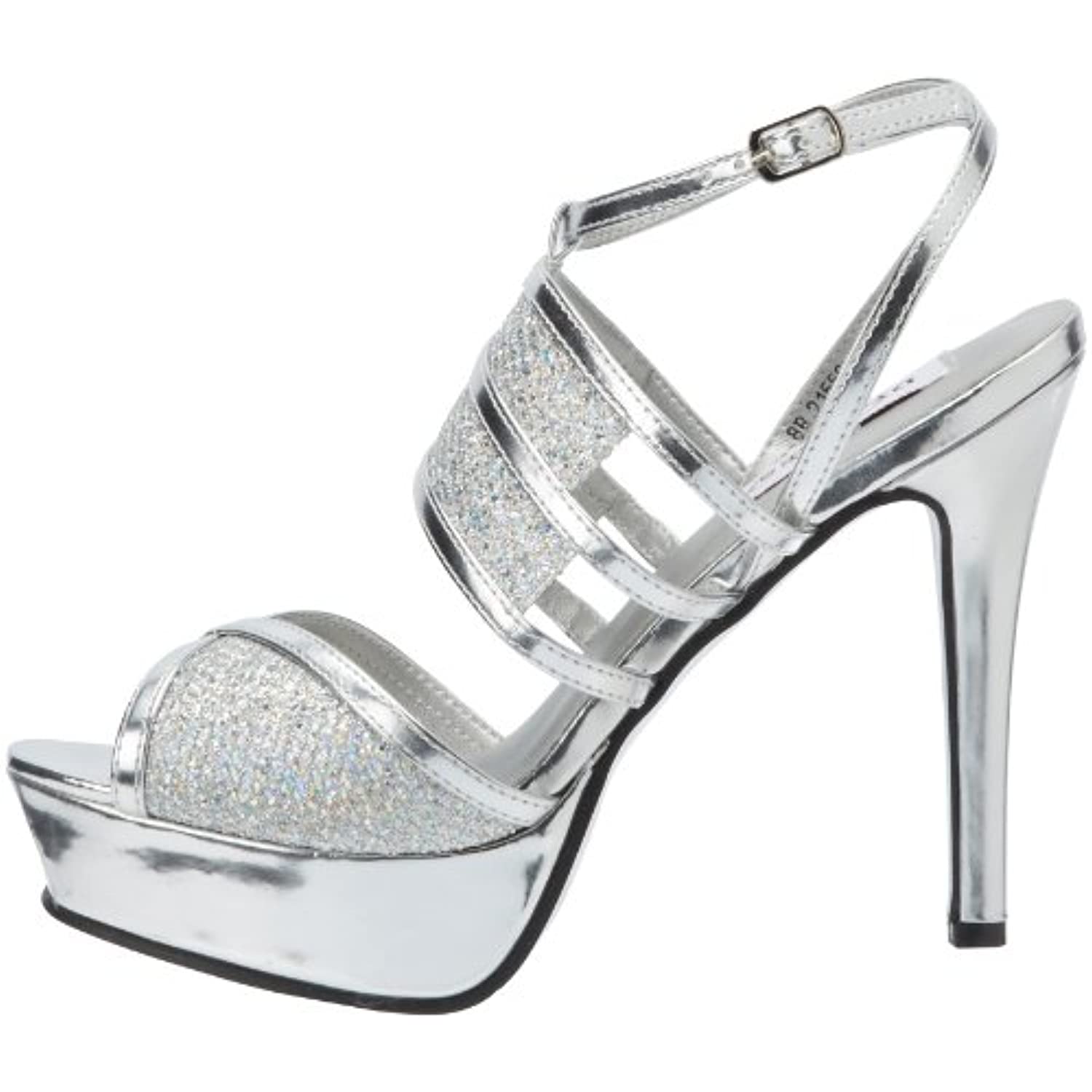 Rumer is a sexy style that combines a silver mirror fabric with iridescent glitter. This 4 inch heel has a platform that improves comfort and an adjustable strap for proper fit.