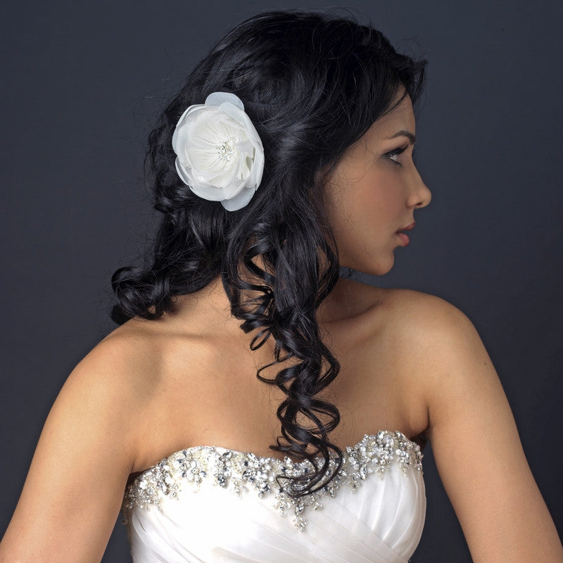 Lovely floral hair clip featuring soft ivory flower petals with feather accent and sparkling rhinestones in the center. This gorgeous piece is a perfect hair accessory that will add subtle and fashionable detail to any ensemble.