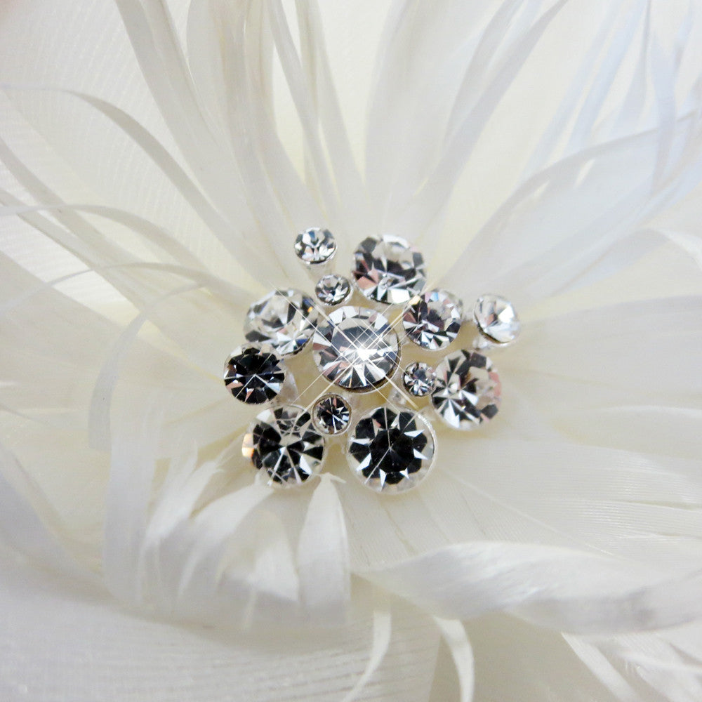 Flower With Feather Accent & Rhodium Silver Plated Rhinestone Cluster Clip 103