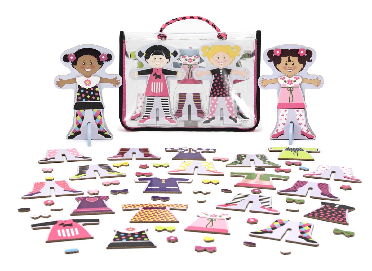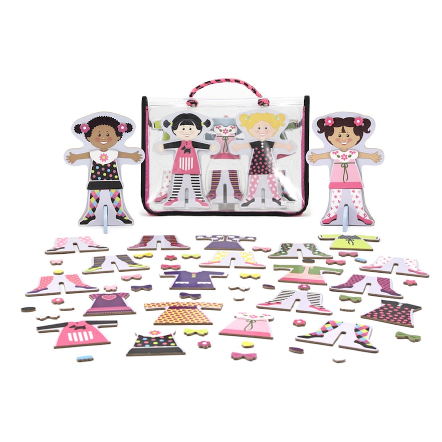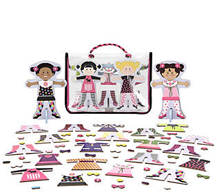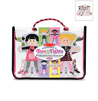 Fashion fun is good to go with this amazing magnetic dress-up set. 2 double-sided, wooden figures with stands are provided for your fashion-minded child to dress-up with in this collection of magnetic tops and tights. Hair accessories are also included in the reusable, vinyl travel pouch complete with stylish handle. Magnet toys can help develop fine motor skills and creative expression. This set makes a great gift for 3-year-olds, 4-year-olds, 5-year-olds, and up. Add the Melissa and Doug Abby and Emma Magnet Play Set to round out the play experience and give kids another engaging option for screen-free fun. For more than 30 years, Melissa and Doug has created beautifully-designed imagination- and creativity-sparking products that NBC News called “the gold standard in early childhood play.” We design every toy to the highest-quality standards, and to nurture minds and hearts. If your child is not inspired, give us a call and we'll make it right. Our phone number is on every product! Gender: female.
