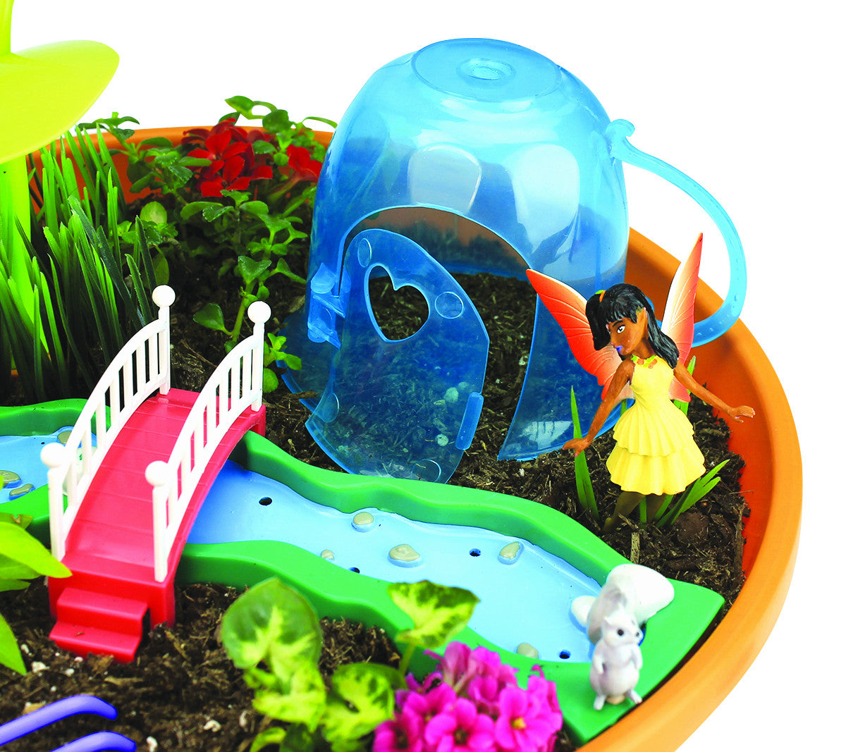It's a serene garden play area for fairy fun! The set includes everything needed to set up a play area: teacup house with opening doors, bottom tray, leaves and stem, stream, bridge, Calla the fairy, her squirrel friend Nutmeg, and gardening accessories and tools. Also included are soil and quick-germinating seeds to get your garden started! Children can add other flowers or plants if they want, too! It’s a fun growing and play set!