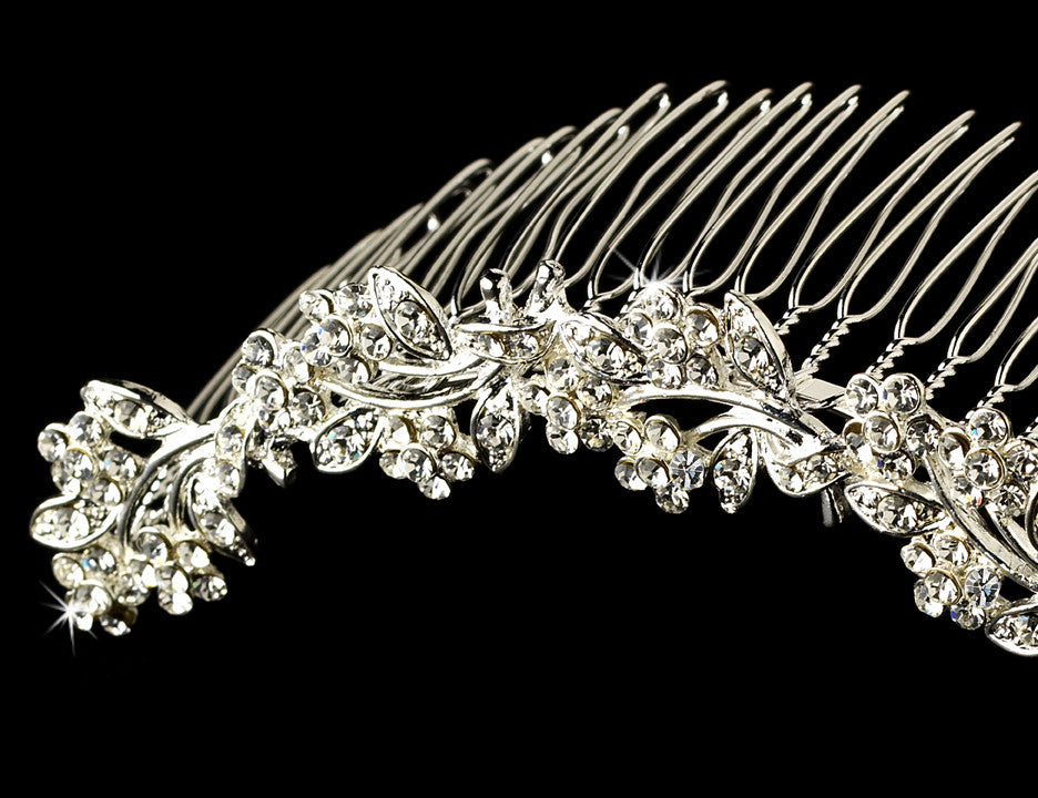 A floral pattern of clear rhinestones makes this comb ideal for any summer or spring wedding. Versatile, this piece is excellent for the modern, classic, or vintage bride. The fastening portion of the comb is virtually invisible when placed in your hair and the ornament will make your hair sparkle. Great with bridal up-dos, the ornament measures 5" wide and 7/8" tall, and rests on top of a 1-1/2" comb.