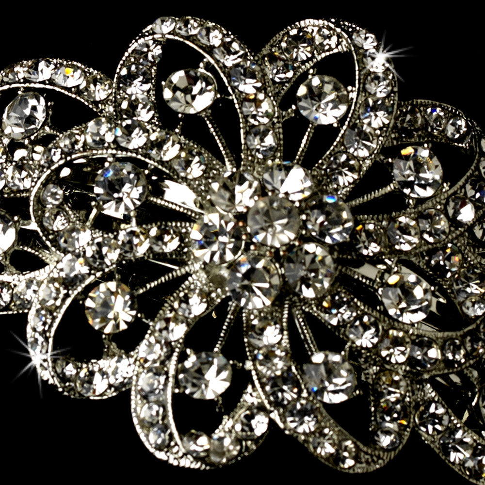 This beautiful barrette is the perfect touch to add sparkle to your special occasion. The silver plated barrette is fully covered with rhinestone crystals and can be worn in the hair in several ways.Dimensions: Front (Length = 4.5 inches) (width = 2.25 inches) Back (barrette = 2.5 inches long)