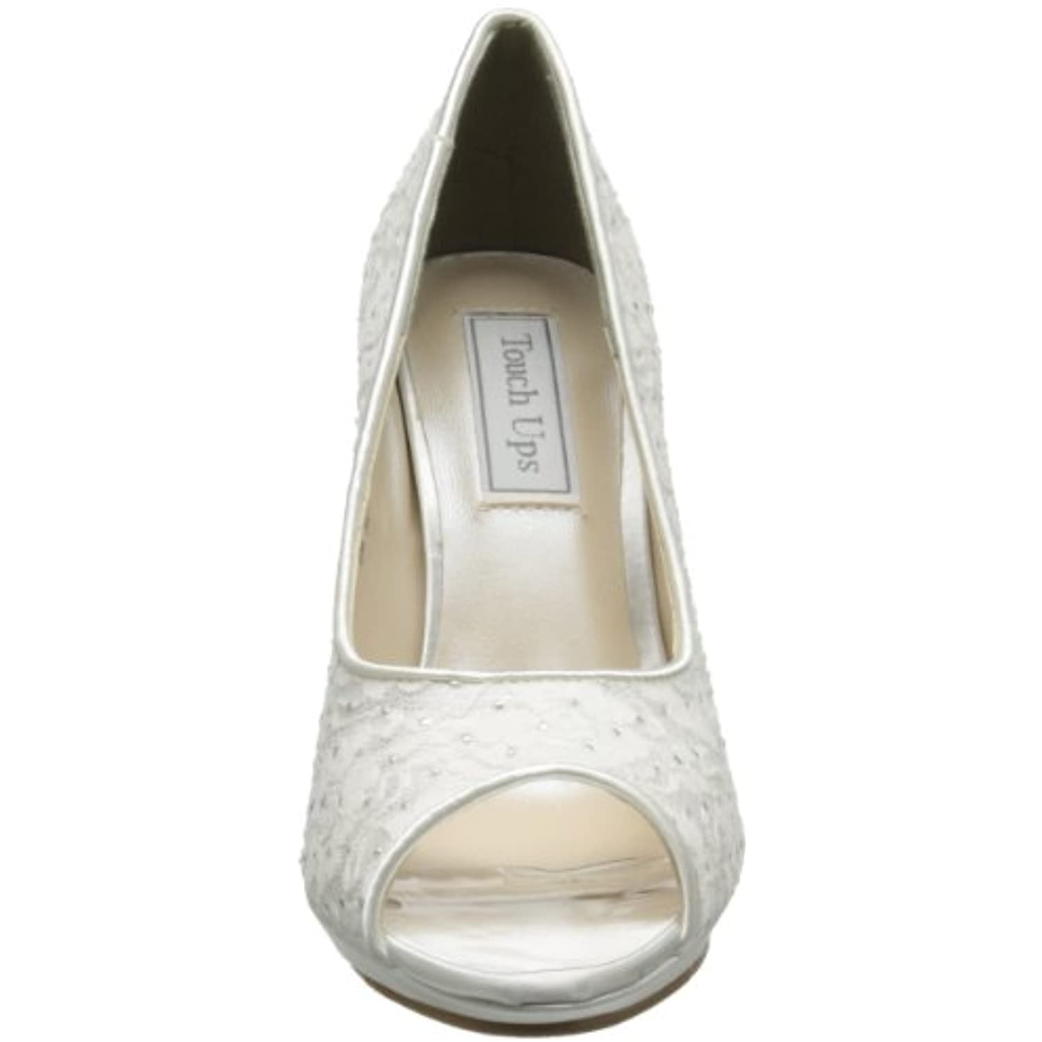 You're the very picture of elegance in the Touch Ups Classy pump, a foot-flattering shoe that will elevate your special day. This high-heeled women's peep-toe dress shoe has a dyeable, lace-topped satin upper dotted with pearlized silver mini studs. A lightly cushioned footbed eases your stride atop the wrapped stiletto heel, covered platform and smooth leather sole of the Touch Ups Classy peep-toe pump.