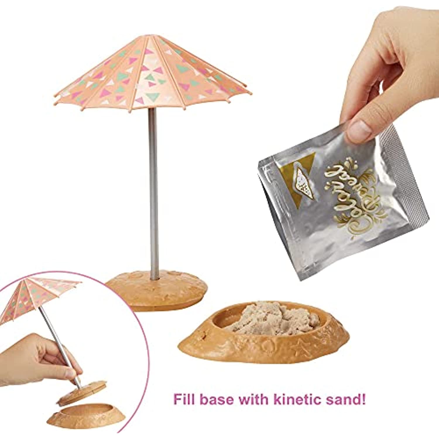- Open the mystery bags to reveal their surprises -1 pet dolphin, 2 watermelon-themed fashion outfits, a plug-in ponytail hair piece and additional sun-themed accessories like a sun umbrella, sand box and kinetic sand!