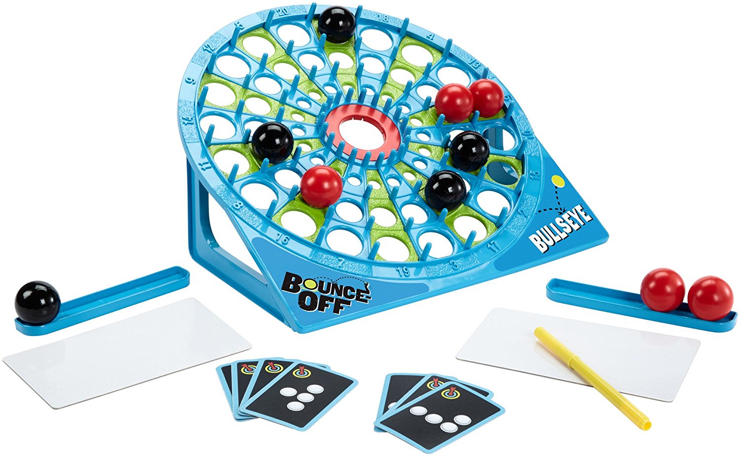 It’s the Bounce-Off you love—with an added challenge! You still have to use a steady hand to bounce your way to matching the design on the card, but now you have to finish by landing a bulls eye! Instructions offer other ways to play as well, but they all involve a competitive Bounce Off!