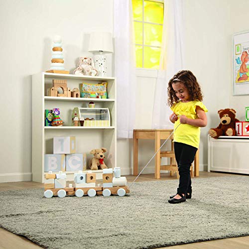 Set the scene for imagination and creative play! Get early learning skills off to a rolling start with this oversized version of a classic wooden pull train toy, great for older toddlers (ages 2+) or as a decorative piece in a nursery or playroom. Stack, sort, build, and Count the 14 beautifully crafted solid-wood blocks in soft white, blue-gray, and natural colors that fit onto three interlocking rolling train cars. When connected, the train stretches more than two feet long!