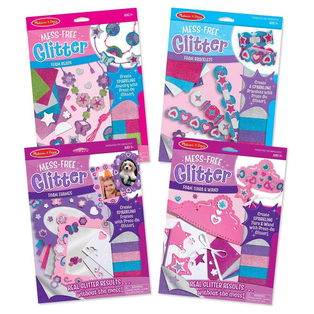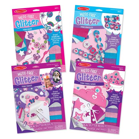 This fourpk includes Melissa and Doug's Mess-Free Glitter Foam Beads, Bracelets, Frames, Tiara and Wand sets. Our patented technology lets kids get the look and feel of real glitter without the mess. Just peel away a section of white paper from the cards to reveal the sticky surface, then select a colored glitter sheets to press on for instant sparkling art. This assortment lets kids create dazzling beaded jewelry, adjustable foam bracelets, princess accessories, and two 4"x 6"foam picture frames! Gender: female.