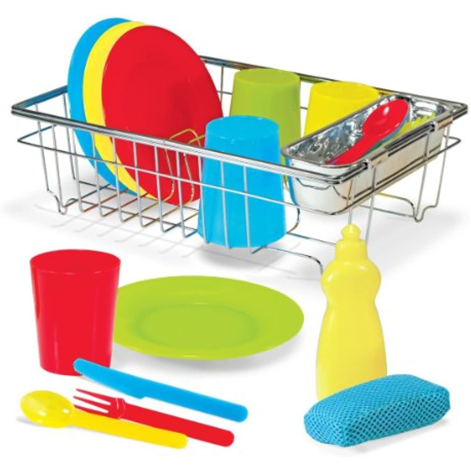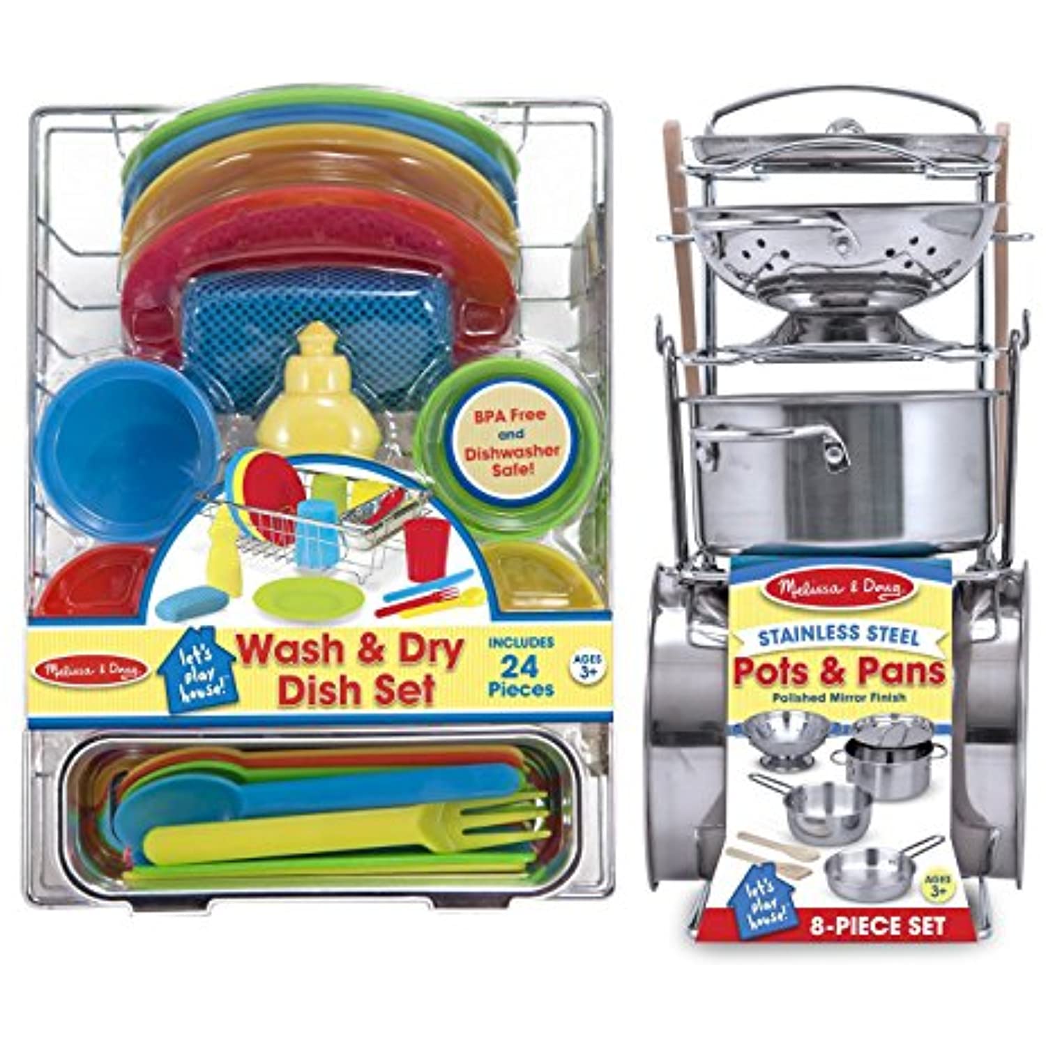 - PRODUCT SPECIFICATIONS – Package contains (1) Melissa & Doug Stainless Steel Pots and Pan Set with colander, pot with lid, 2 pans, 2 wooden utensils, and rack and (1) Melissa & Doug Let's Play House! Wash and Dry Dish Set with 4 place settings, soap bottle, mesh-covered sponge, and metal drying rack with utensil insert. Recommended for ages 3+.