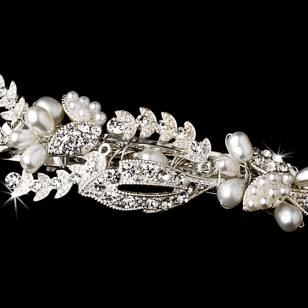 Silver barrette featuring white faux pearls and silver rhinestone encrusted flower petals. An elegant piece perfect to accessorize your hair style on your special day.