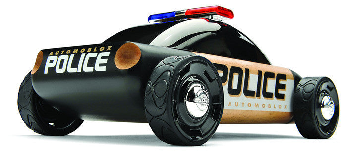 This sedan, made of European beech wood, gets the police treatment! This special pursuit model features high-quality satin painted front and rear blocks, prominent push bar, a brilliant light bar, spcial wheels and graphics. Includes 14 components to build the car, and those mix-and-match pieces also work with other original Automoblox™ vehicles! Measures approximately 8" when assembled.