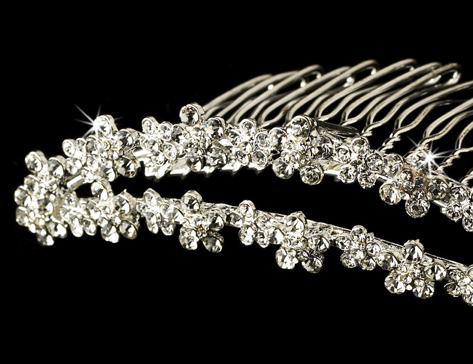 This lovely alternative to the full tiara features a silver plated double band of rhinestone encrusted flowers. Simply beautiful, the piece is perfect for the modern, vintage, or classic bride. The ornament measures 3-1/2" wide and 3/4" tall, and rests on a 2-1/4" comb.