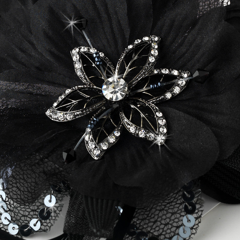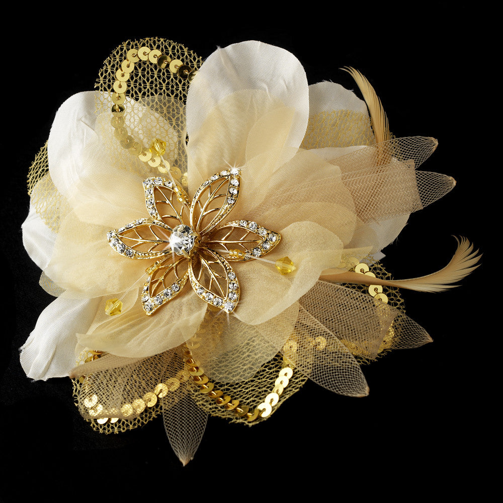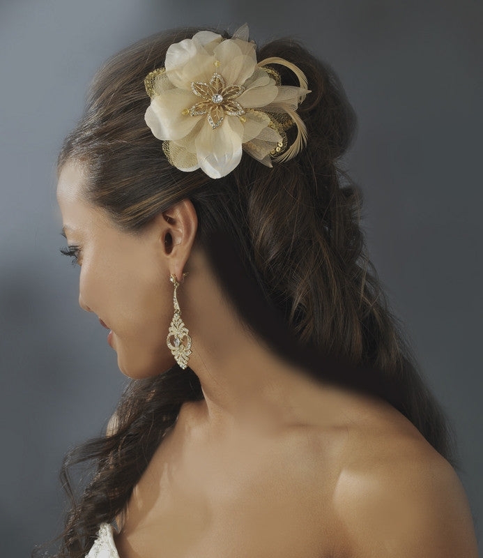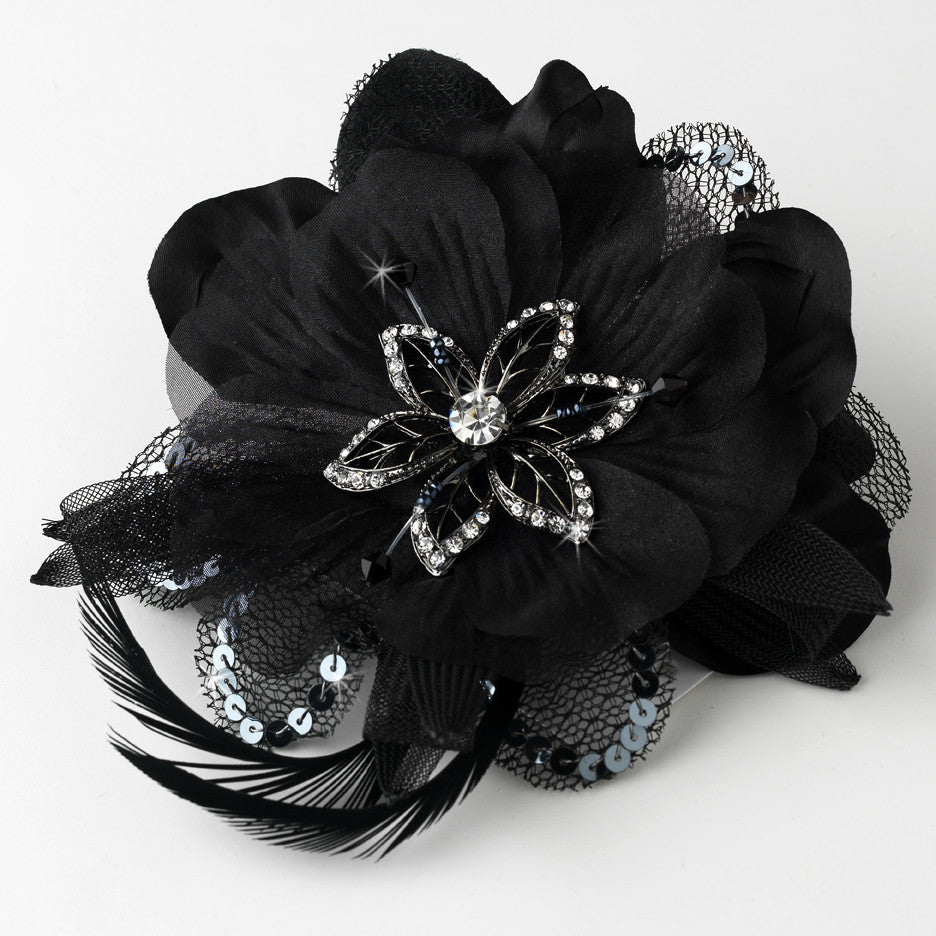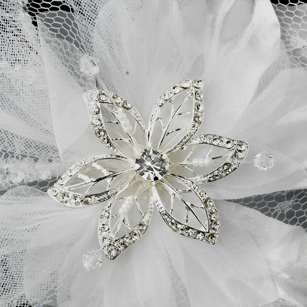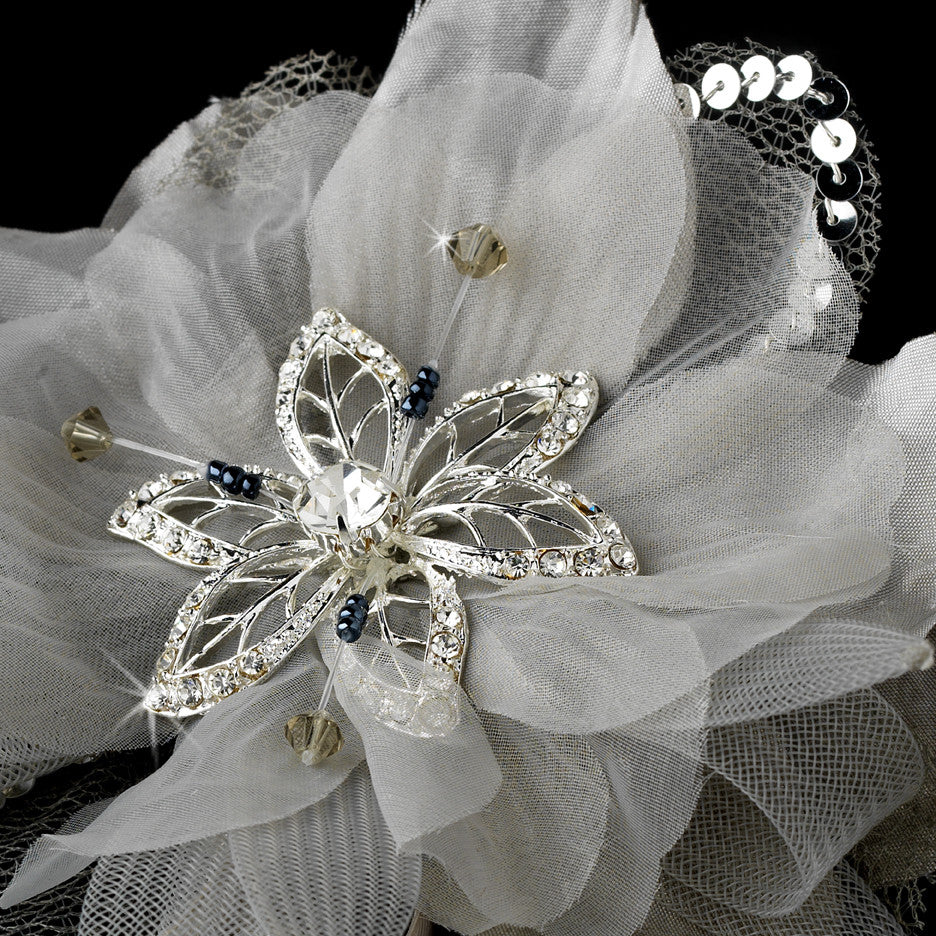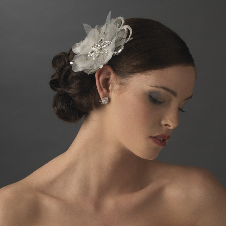 This darling flower hair clip is just ever so lovely! Featuring fabulous sprays of soft feathers, wonderful flower petals made from matte satin silk, sheer organza and birdcage veiling with sequined edges, and a gorgeous silver plated flower charm in the center gorgeously adorned with glittering clear rhinestones and sprigs of clear crystal beads. This versatile piece can be worn in the hair as well as on a dress, with both an alligator hair clip and pin on the back. This is splendid choice for the bride or for her beautiful bridesmaids.