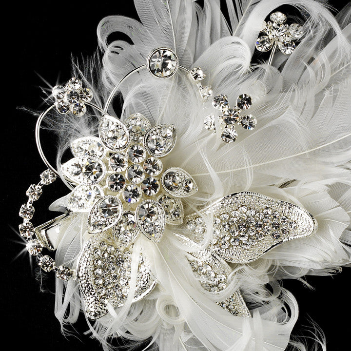Stunning and exquisite! This more than fabulous bridal hair clip features a dazzling antique silver plated flower encrusted with sparkling clear rhinestones and sprays of curling feathers that add an extra touch of glamour to this already remarkable piece. This piece comes in both white and ivory.