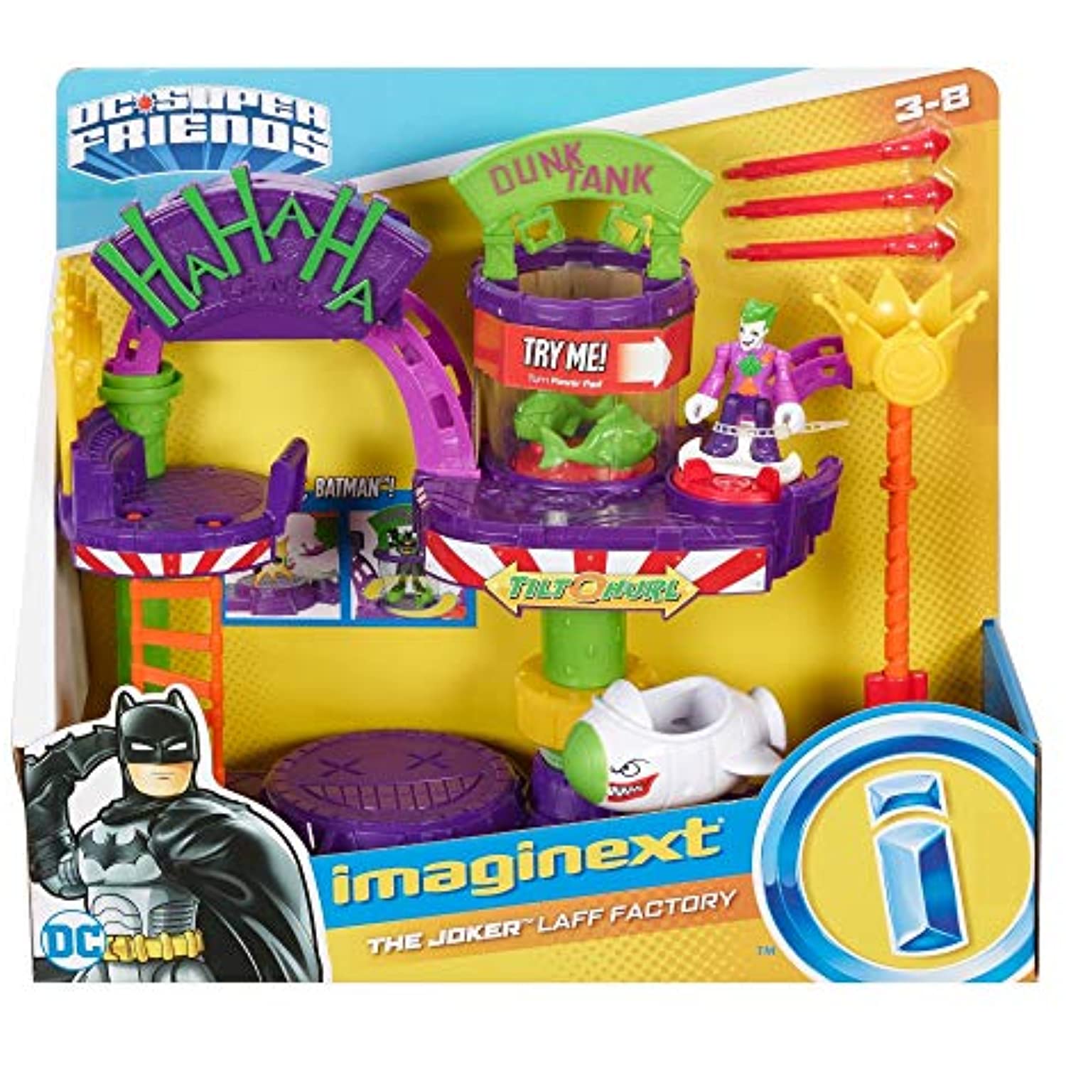 The Joker, iconic Super-Villain of Gotham City, plans all his devious attacks from his evil lair, the Laff Factory. Power Pads bring all the action to life, including a spinning rocket ride, "swimming" fish in the dunk tank, projectile launchers, and a spinning elevator! Kids can create exciting, villainous adventures with Batman's foe and this action-packed playset. Imaginext Imagine What's Next!