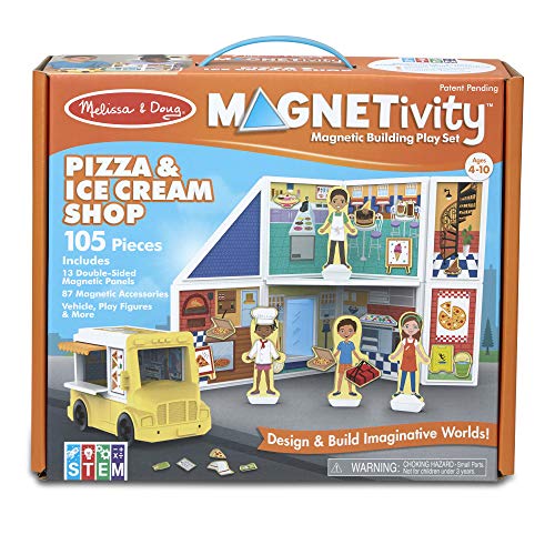 - 105-piece Magnetivity Magnetic Building Play Set with a restaurant theme lets kids design, build, and play with their own pizza and ice cream shop again and again