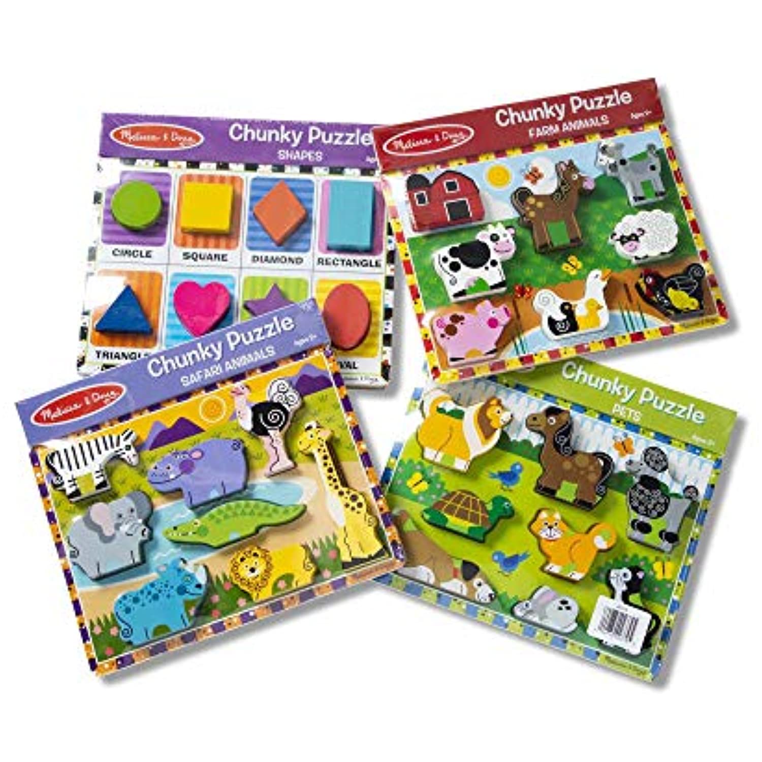 Melissa & Doug wooden chunky puzzles are just right for toddlers and preschoolers! they’re easy to handle, quick to solve, and filled with colorful artwork in favorite themes. Thick puzzle pieces also stand up for pretend play. This assortment of four 12-inch by 10.75-Inch puzzles (eight pieces each) includes beginning puzzler and early learning favorites farm animals, pets, safari animals, and shapes.