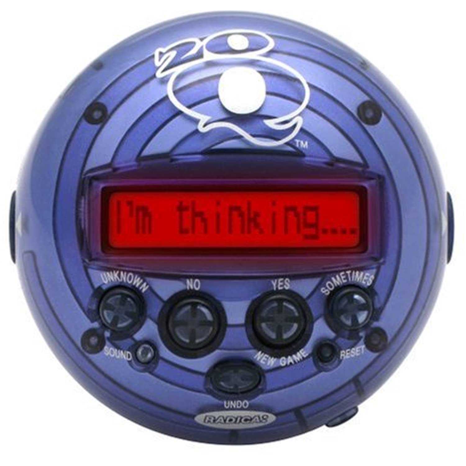 Amazon.com       #review { width: 100%; font-family: Verdana, Helvetica neue, Arial, serif; font-size: 12px; } .caption { font-family: Verdana, Helvetica neue, Arial, serif; font-size: 10px; font-weight: bold; font-style: italic; } Plenty of hand held electronic games can be fun but it takes a special game to be both entertaining and deeply unsettling. This small spherical game of 20 Questions looks like it rolled right out of 1979 with a retro design, old arcade style sound effects, and a red light display for its various questions and guesses. Game play could not be simpler. Just think of something and then answer the ball's assorted queries by pressing buttons for yes, no, sometimes, or don't know. In our informal test, the ball accurately guessed our selection of giraffe, motorcycle, and sock but came up a little short on buttered toast. Two AA batteries are required and included. --Charlie Williams Innovative "Artificial Intelligence" game with an exciting new design.        From the Manufacturer      I can read your mind. To play, think of something, anything, then answer a series of 20 questions. After the last question, your answer will appear. It really works. Its hours of fun as your try to stump 20 Questions. Your friends will watch in amazement as 20 Questions tries to guess what you're thinking. If it guesses within 20 questions, it wins. If not, you win! Can you stump the all-knowing artificial intelligence of 20 Questions? Requires 2 AAA batteries, included. Colors may vary from item shown.