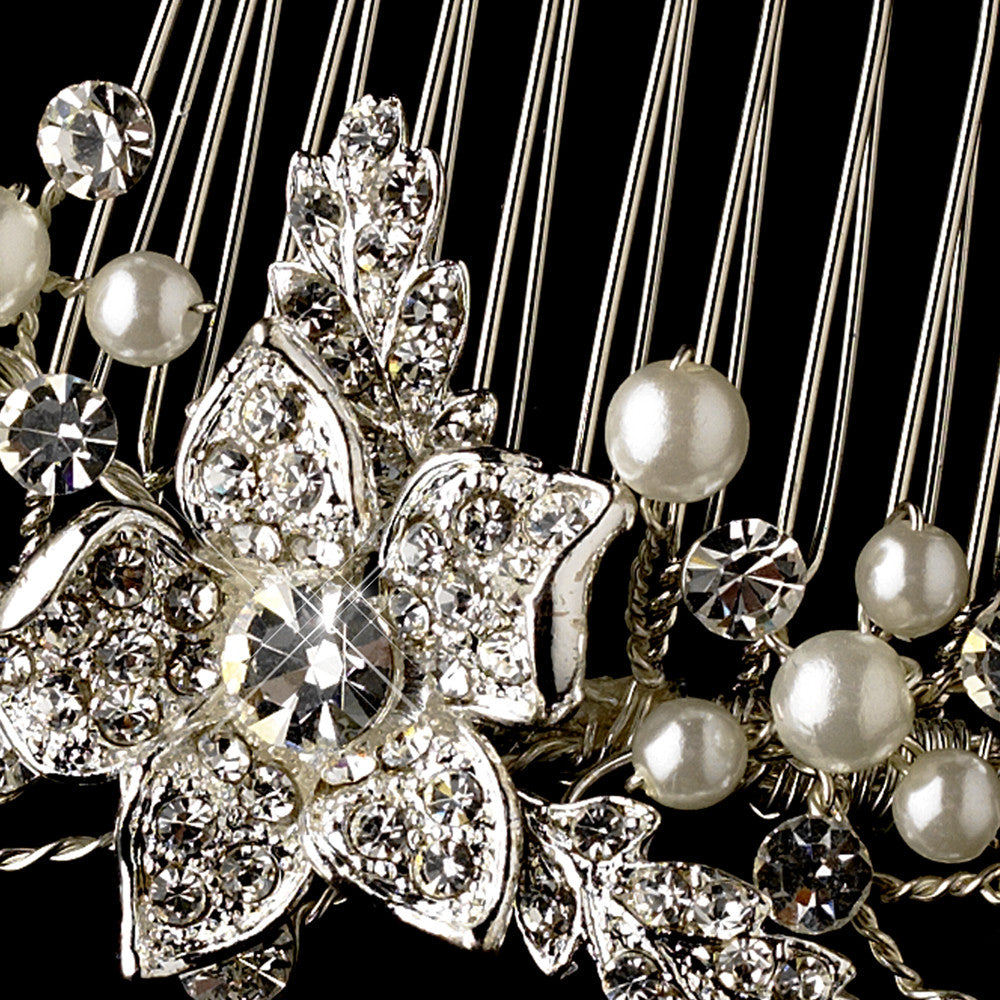 This dazzling simple comb features ivory pearls and clear rhinestones encrusted in a silver plated floral design. This beautiful arrangement is delicate and looks fabulous on any bridal updo that offers that small touch of shine you've been looking for.