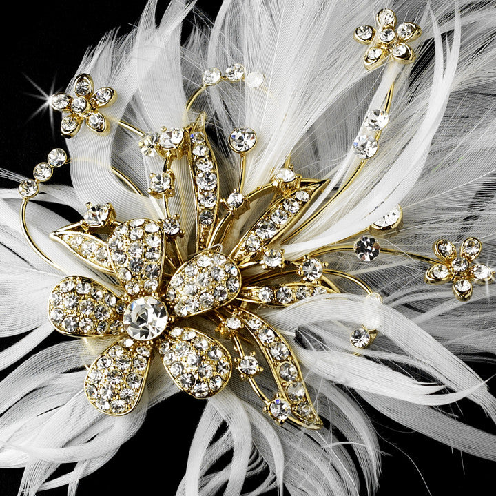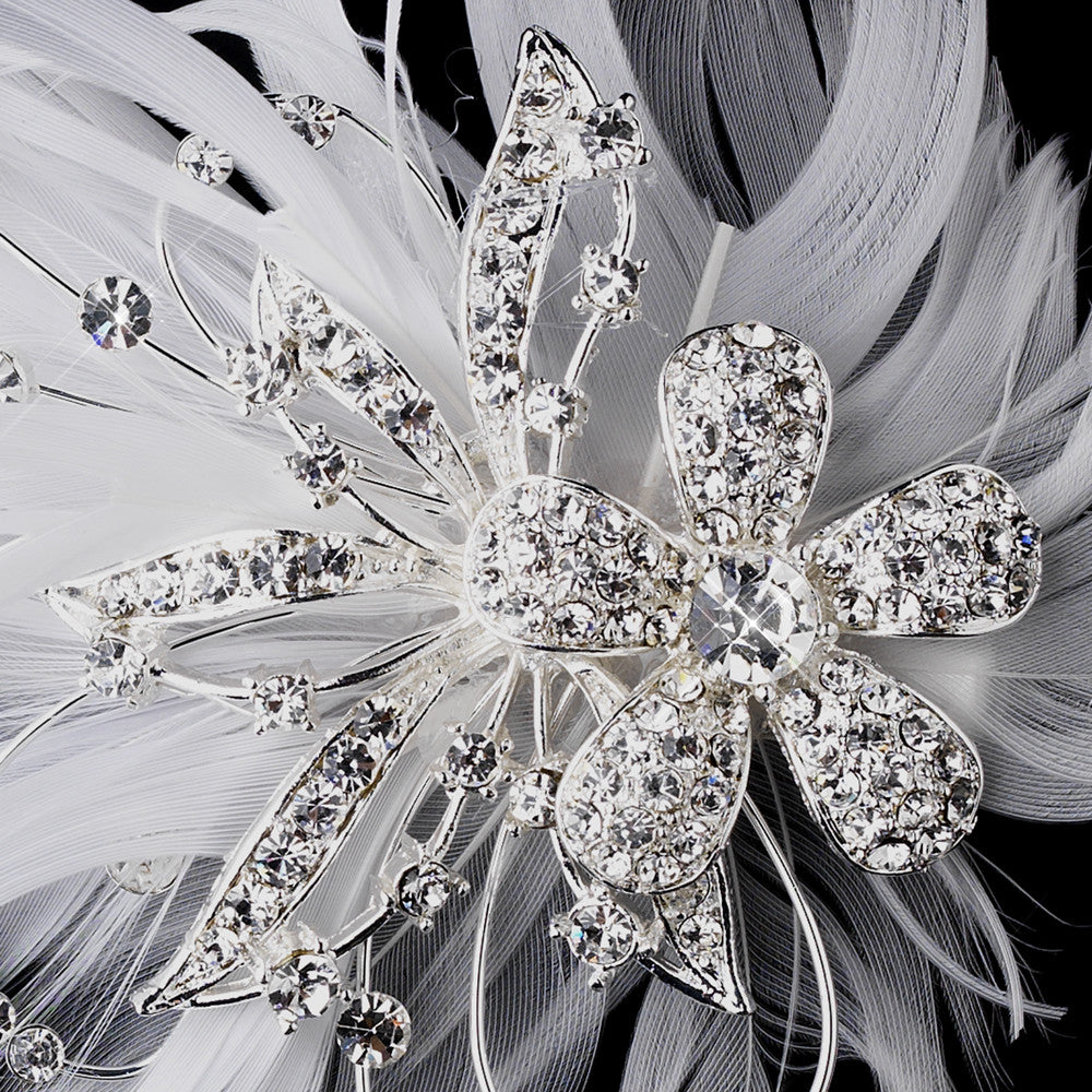 Alluring and enchanting, this stunning bridal hair clip features brilliant rhinestone encrusted flowers with sprays of fabulous white or ivory feathers. The back of this clip has both a pin to fasten to a gown and an alligator clip to wear as a unique hair accent.