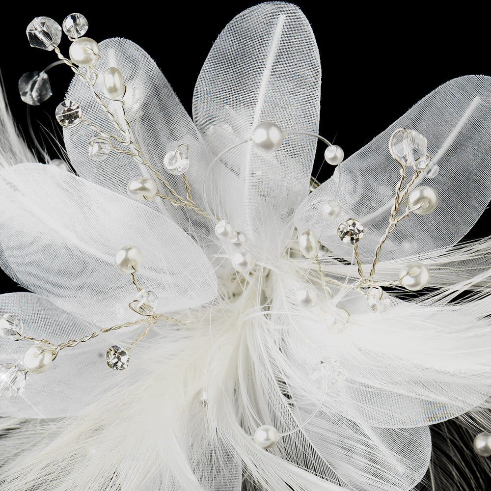 This ravishing flower hair clip features a luscious composition of fabulous white feathers with sprigs of luminous white or ivory faux pearls, sparkling clear Austrian crystals and dazzling clear rhinestones. This is a stunning choice for the bride who has a love for all things vintage!