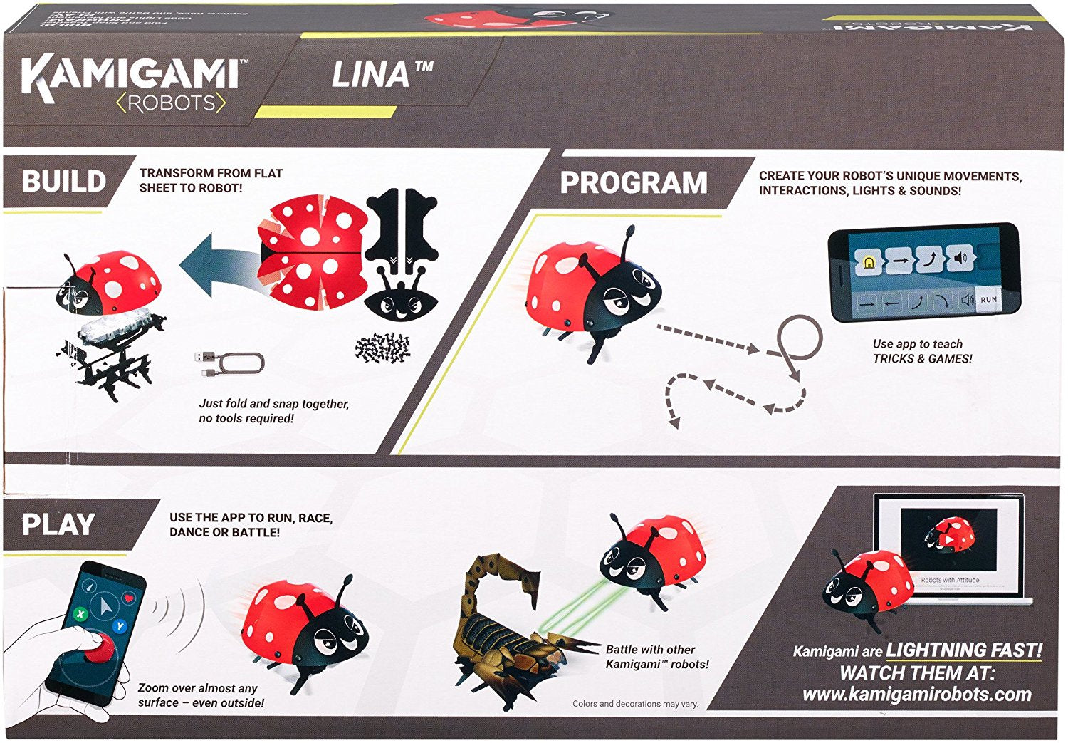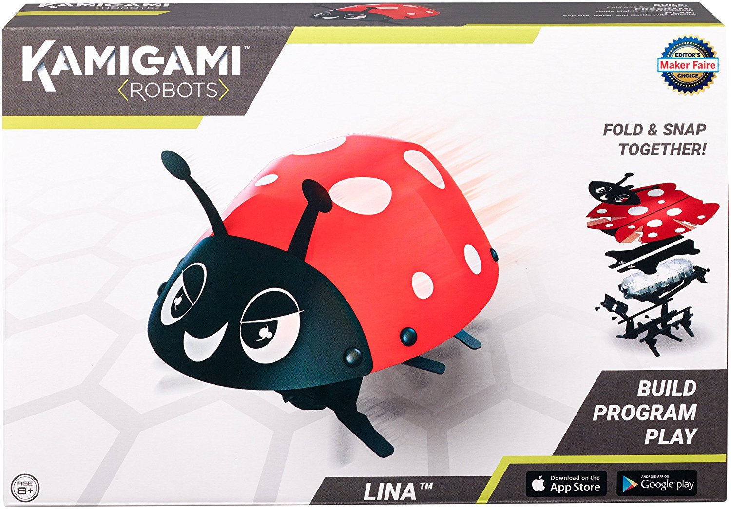 Kamigami is a build-it-yourself robot platform using foldable plastic material. It is the perfect STEM toy because it makes building your own robot easy, yet rewarding – no engineering degree or tools required! Designed after nature's fastest critters, they magically fold up from a flat sheet & zoom over almost any terrain, even outside. Download the free app from your favorite app store to drive your Kamigami robot, battle with friends, play interactive games, or, best of all, design and program your robot's reactions, games and movements. The visual programming interface makes it easy to blink lights, play sounds and maneuver around obstacles. The app will continually offer new updates and game suggestions, so there's no room to get bored. Kamigami robots are light as a feather and quick as a bug!