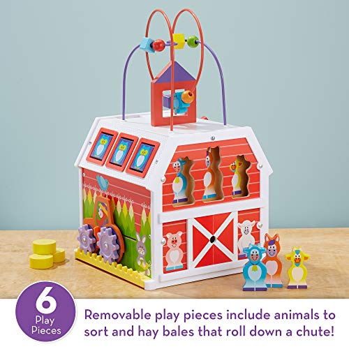 - Sturdy wooden farm-themed activity barn with both attached and removable pieces to slide, sort, and roll