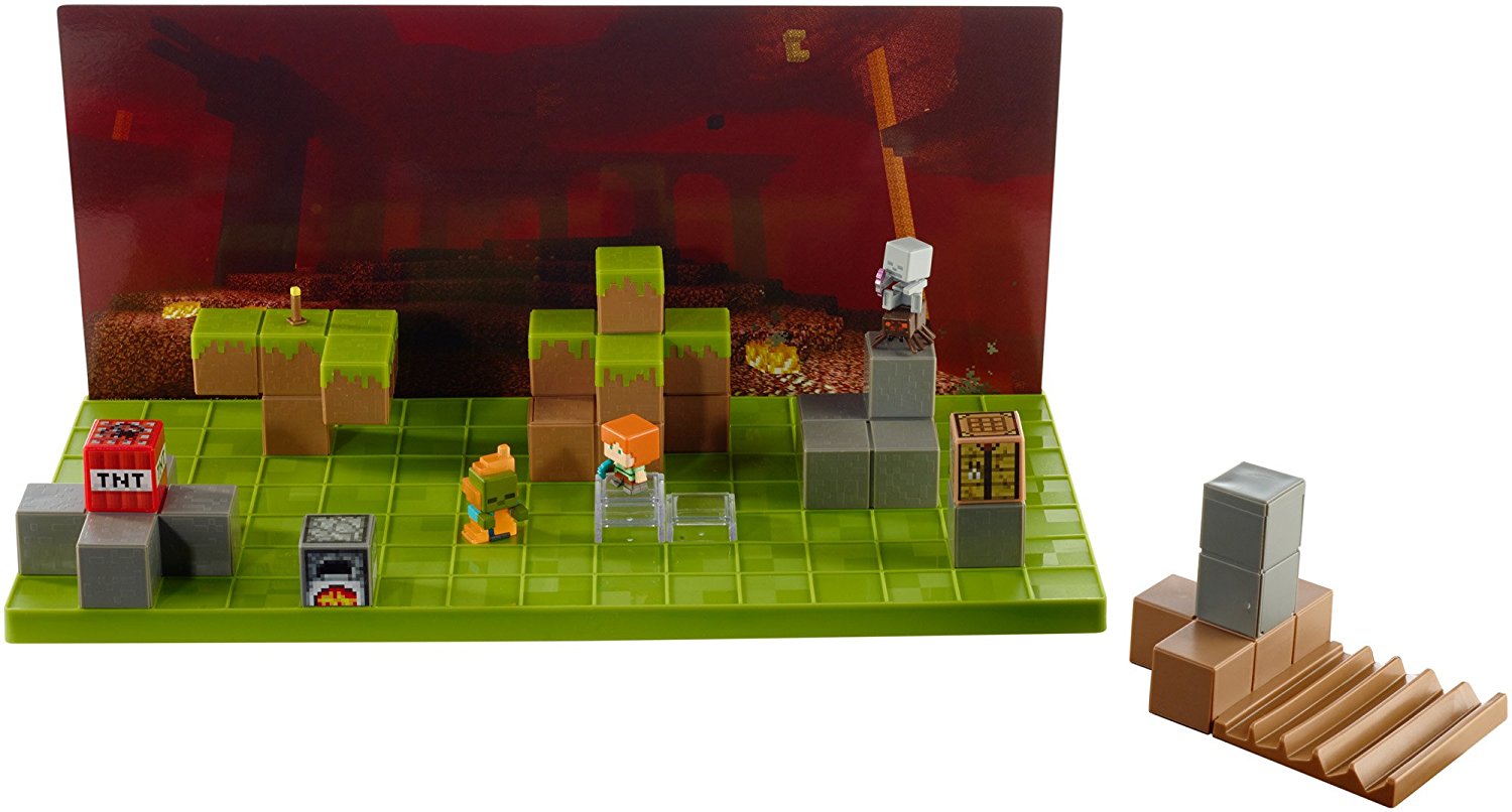 - 4 mini-figures include Exclusive Spider Jockey (with Enchanted Bow), Exclusive Alex (with Diamond Pickaxe), and Zombie and Zombie in Flames, which can be swapped in and out of frames for stop-motion fun