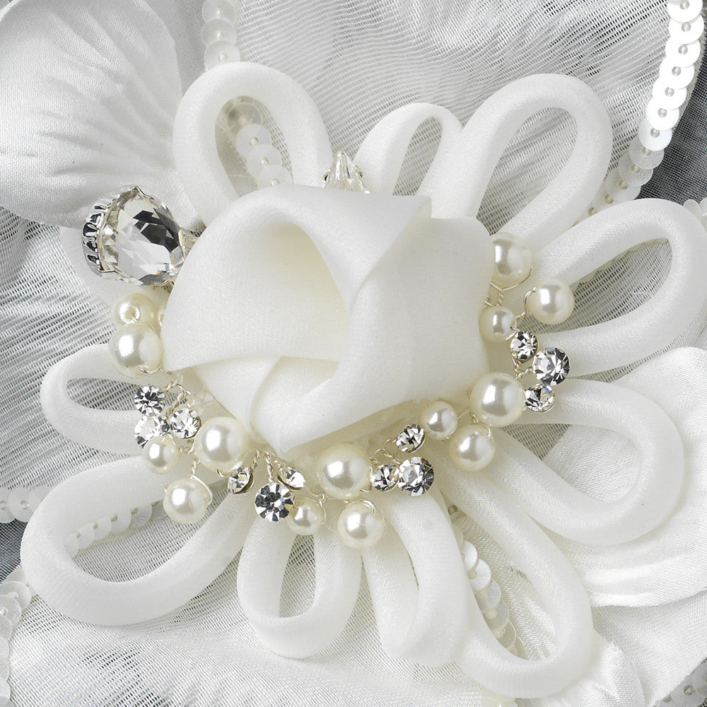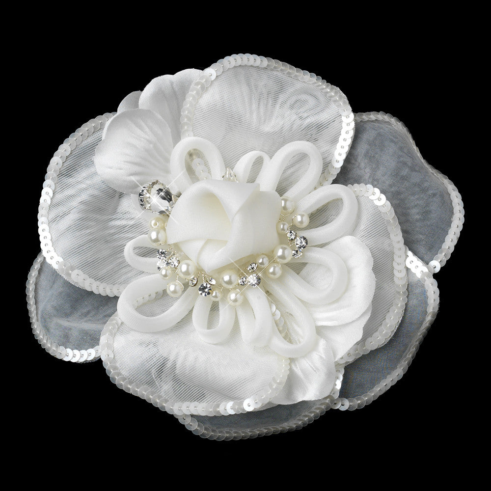 A radiant ivory hair clip that features ivory fabric and rose petals paced in a charming flower with rhinestones and pearl accents in the center and sequence outlining the flower. A classic bridal flower hair clip you can't go wrong with.