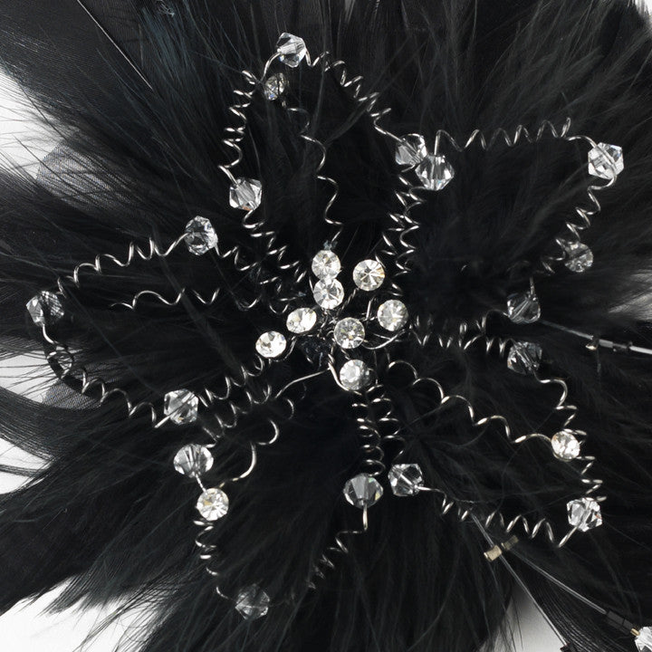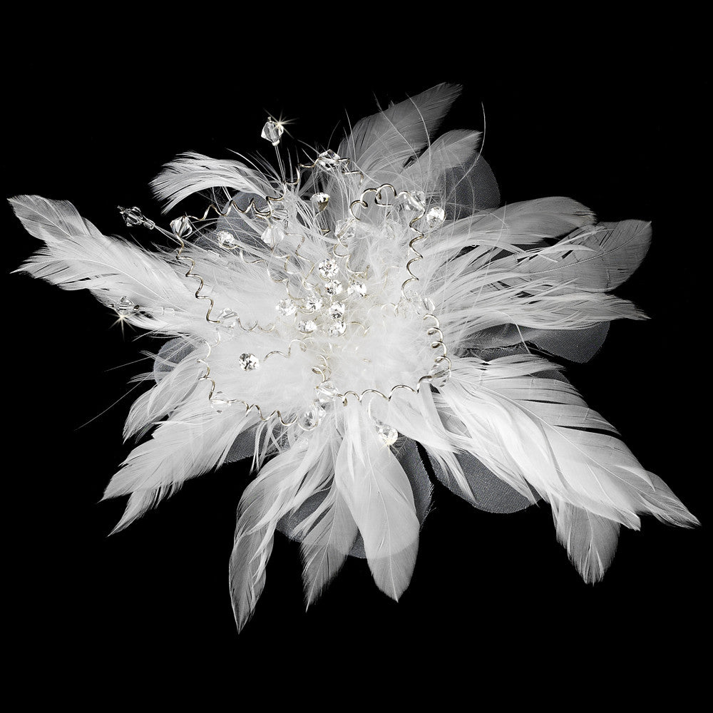 This enchanting feather fascinator features a subtle silver plated wavy flower detail, rhinestones, and swarovski crystals, all nestled into a bed of beautiful feathers. The piece is perfect for the modern or vintage bride. The ornament is 7", and fastens in your hair with a 1-3/4" clip.