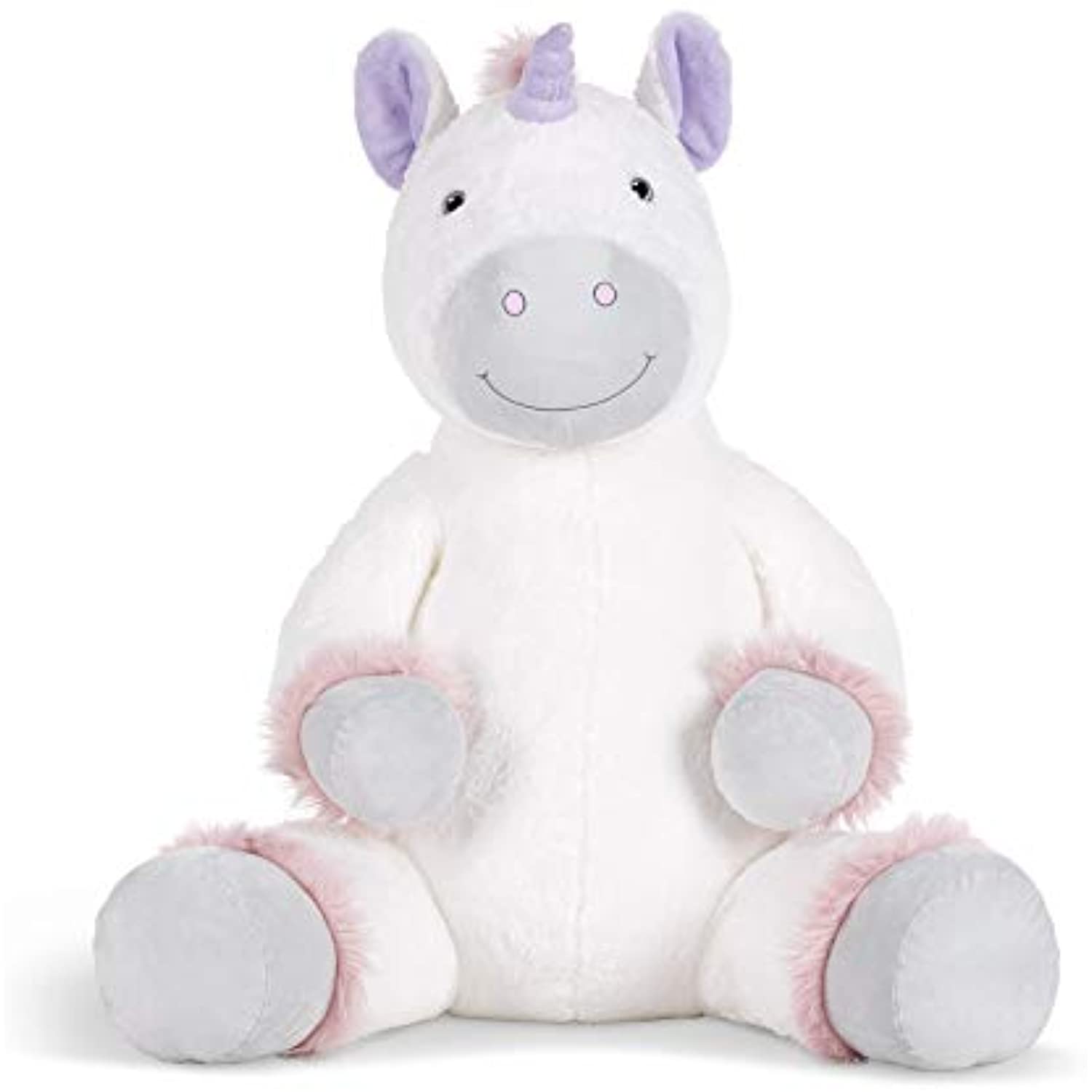 - Giant jumbo-sized stuffed plush white unicorn with pink and purple accents sits nearly 3 feet tall