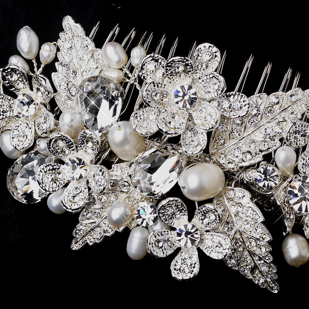 Beautiful hair comb featuring decorative silver ornamentation, sparkling rhinestones and freshwater pearls