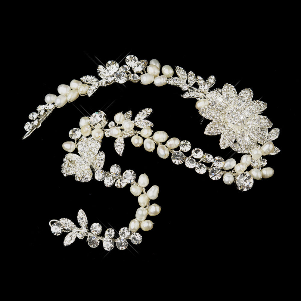 Silver Ivory Freshwater Pearl & Clear Rhinestone Bridal Headpiece Clip 1060