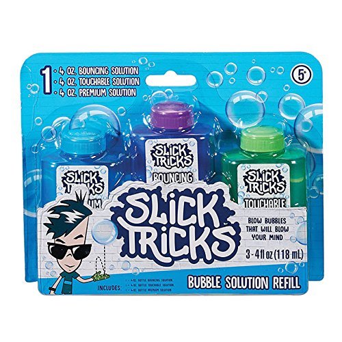 The Slick Tricks Refill Kit includes one 4 fl. oz. bottle of premium bubble solution, one 4 fl. oz. bottle of touchable bubble solution, and one 4 fl. oz. bottle of bouncing bubble solution. Make bubbles that can be stacked and grabbed with the touchable solution. Make bouncing bubbles with the bouncing solution. Or explore the amazing possibilities of bubbles with the premium solution. Encourages exploration, experimentation, and creativity. Use the Slick Tricks Refill kit with Slick Tricks Level Up, Master It, Make it Morph, Make it Stack, Make it Stretch, and Make it Bounce kits.