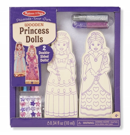 Melissa & Doug Decorate-Your-Own Wooden Princess Dolls Craft Kit:Includes 2 double-sided wooden dolls, stands, 16 gem stickers, 5 colored pencils and 2 glitter gluesEach side features a different princessCraft kit and keepsake in onePerfect activity for parties or rainy daysPromotes fine motor skills, hand-eye coordination and creative expression