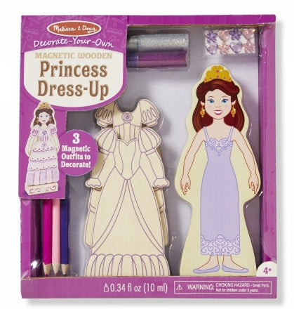 Melissa & Doug Decorate-Your-Own Magnetic Princess Dress-Up:Includes magnetic wooden princess doll, 3 outfits, stand, 3 colored pencils, 8 gem stickers and 2 glitter gluesDecorate the princess and her magnetic outfits, then play or displayCraft kit and keepsake in onePerfect as an individual project or a party activity and favorPromotes fine motor skills, hand-eye coordination and creative expression