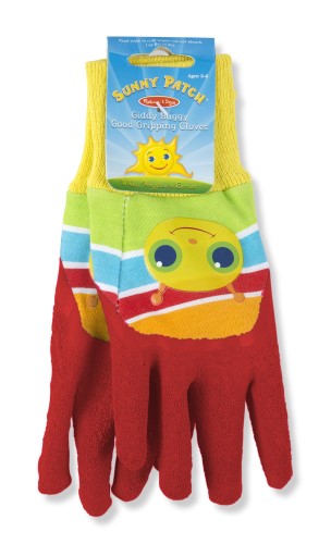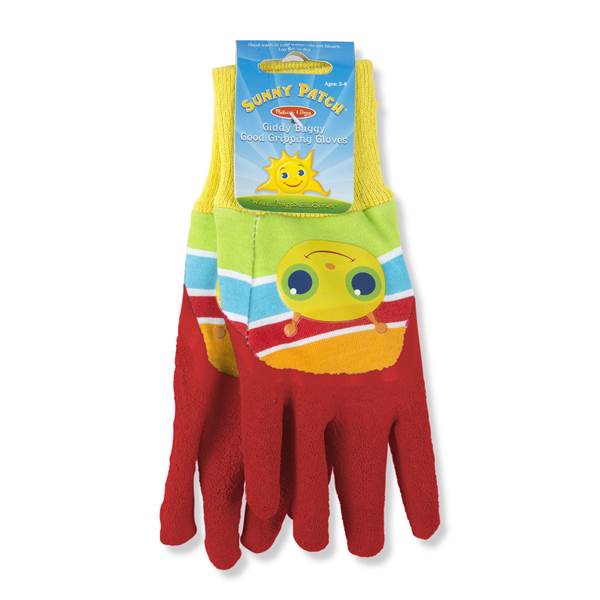 Melissa & Doug Giddy Buggy Good Gripping Gardening Gloves With Easy-Grip Rubber on Palms:Giddy Buggy-themed child-sized gardening glovesMachine washable, sturdy cotton construction with rubber latex coating on the palmsCoating makes it easy to grasp garden tools while keeping hands cleanPromotes gross and fine motor skills, hands-on exploration and outdoor playSized to fit ages 3-6Age range: 3 years and up