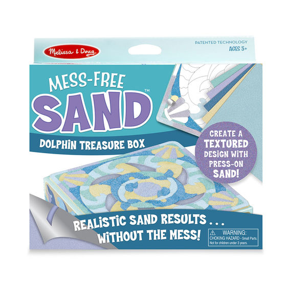 Melissa & Doug Mess Free Sand, Dolphin Box:Dolphin-pattern box top to decorate with the look and feel of real sand without the messSturdy cardboard treasure box (approximately 8.75" x 4.5" x 2.25") and sand sheets in 5 colorsEasy patented process creates instant textured artNo drying, no waiting, no messages 6+8.25" x 11.5" x .25" pkg