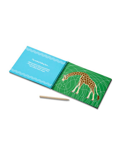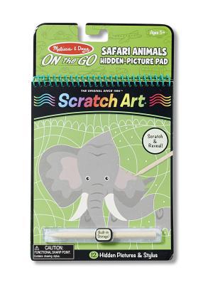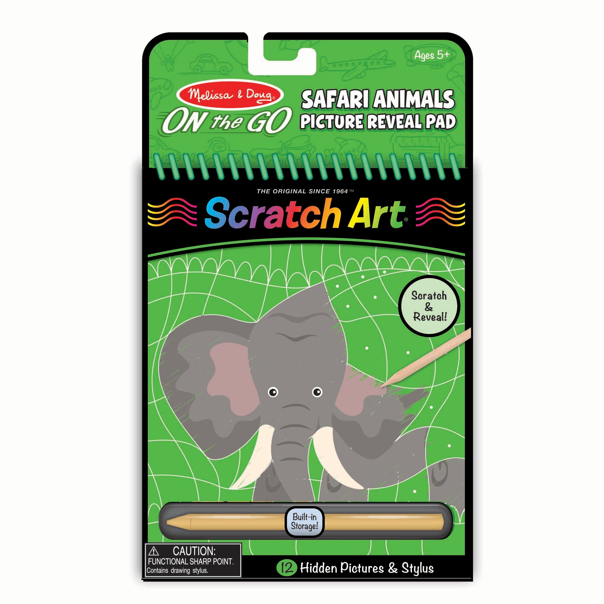 Spiral-bound pad includes 12 hidden-picture Scratch Art pages featuring Safari Animals.Read the clues, then scratch away the coating to reveal answers.Wooden stylus stores in a tray in the cover.On the Go format makes it perfect for families on the move.Great for fine motor skills, hand-eye coordination, and creativity.